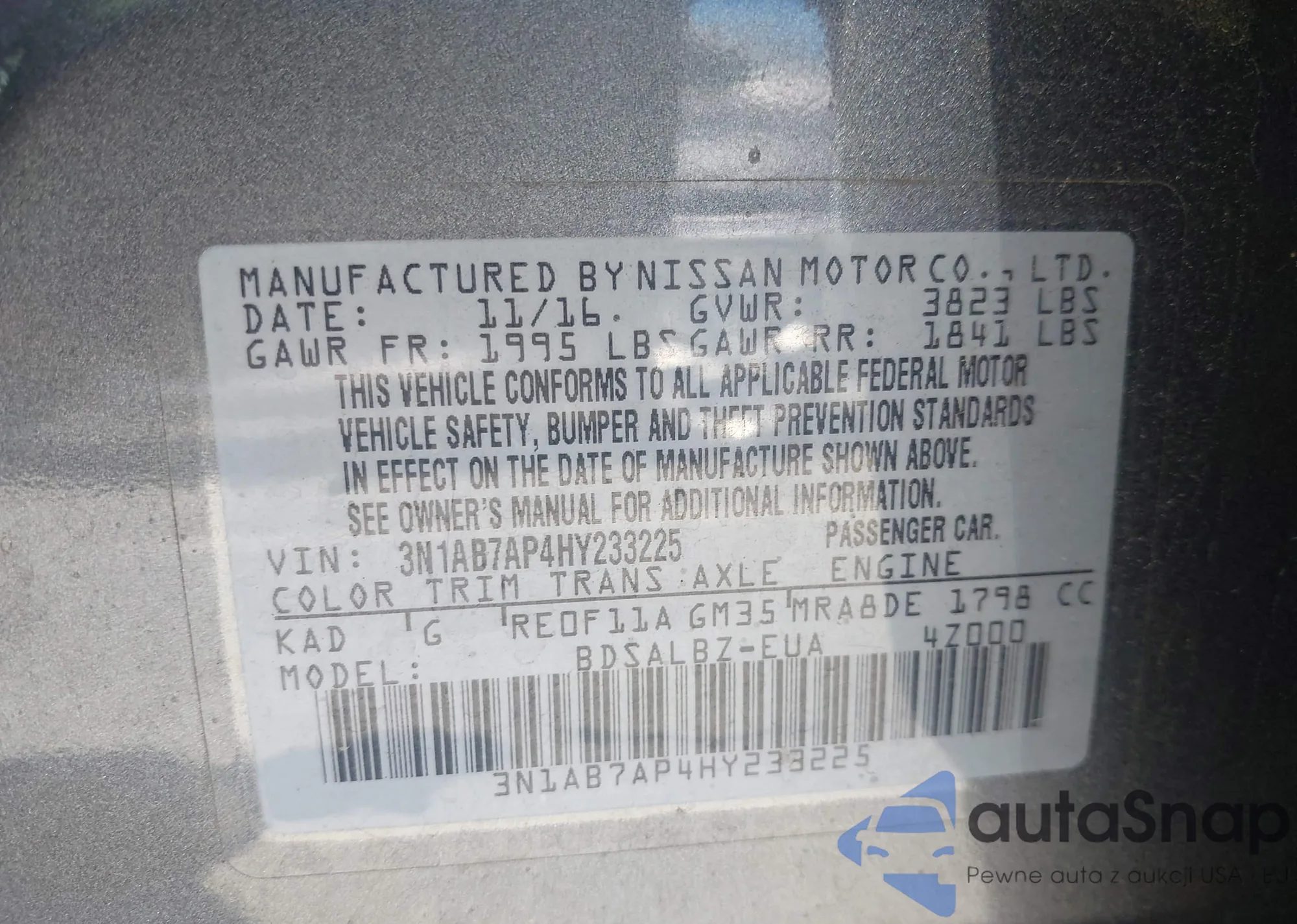 LOT: 42322606 VIN: 3N1AB7AP4HY233225