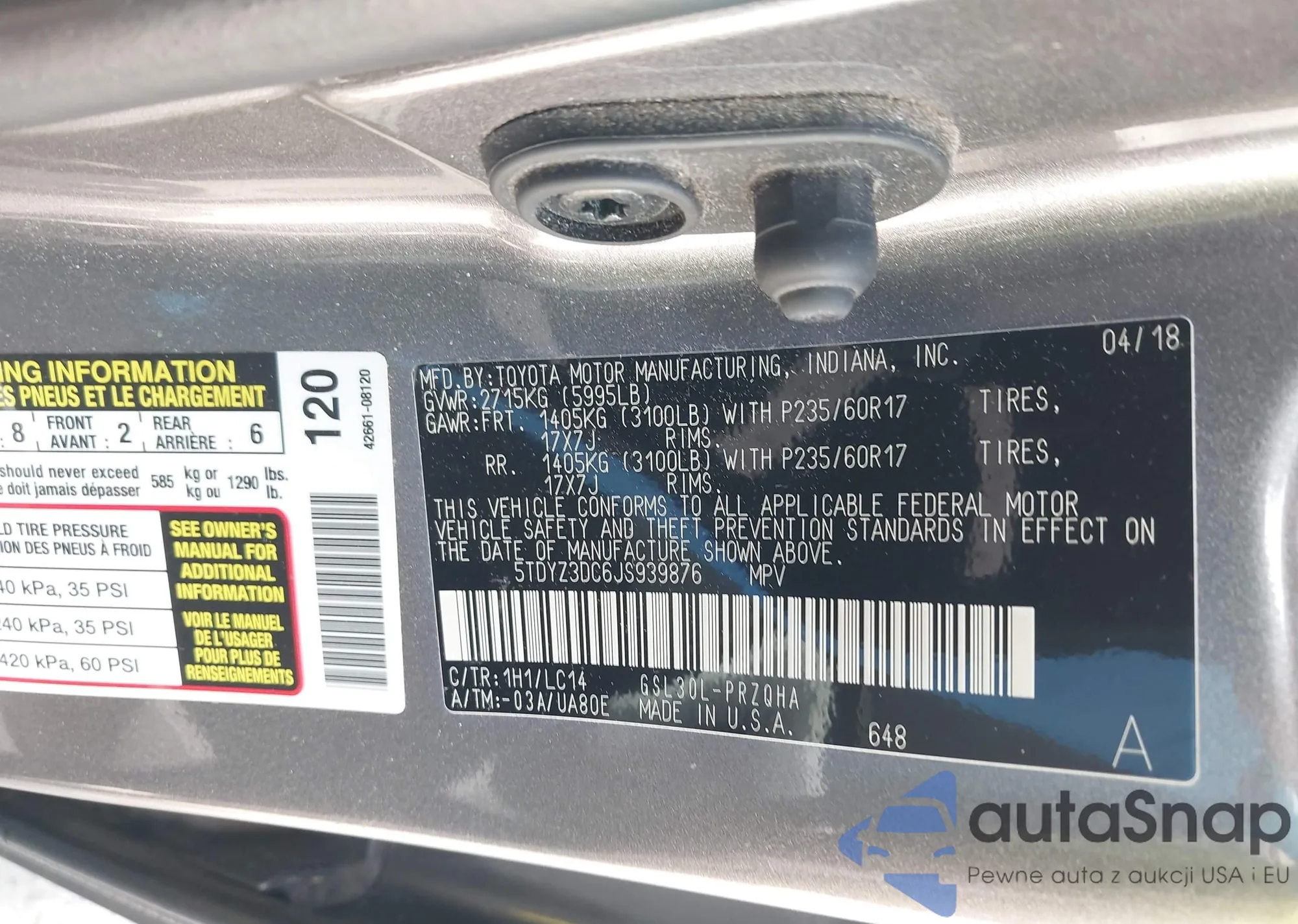 LOT: 42347926 VIN: 5TDYZ3DC6JS939876