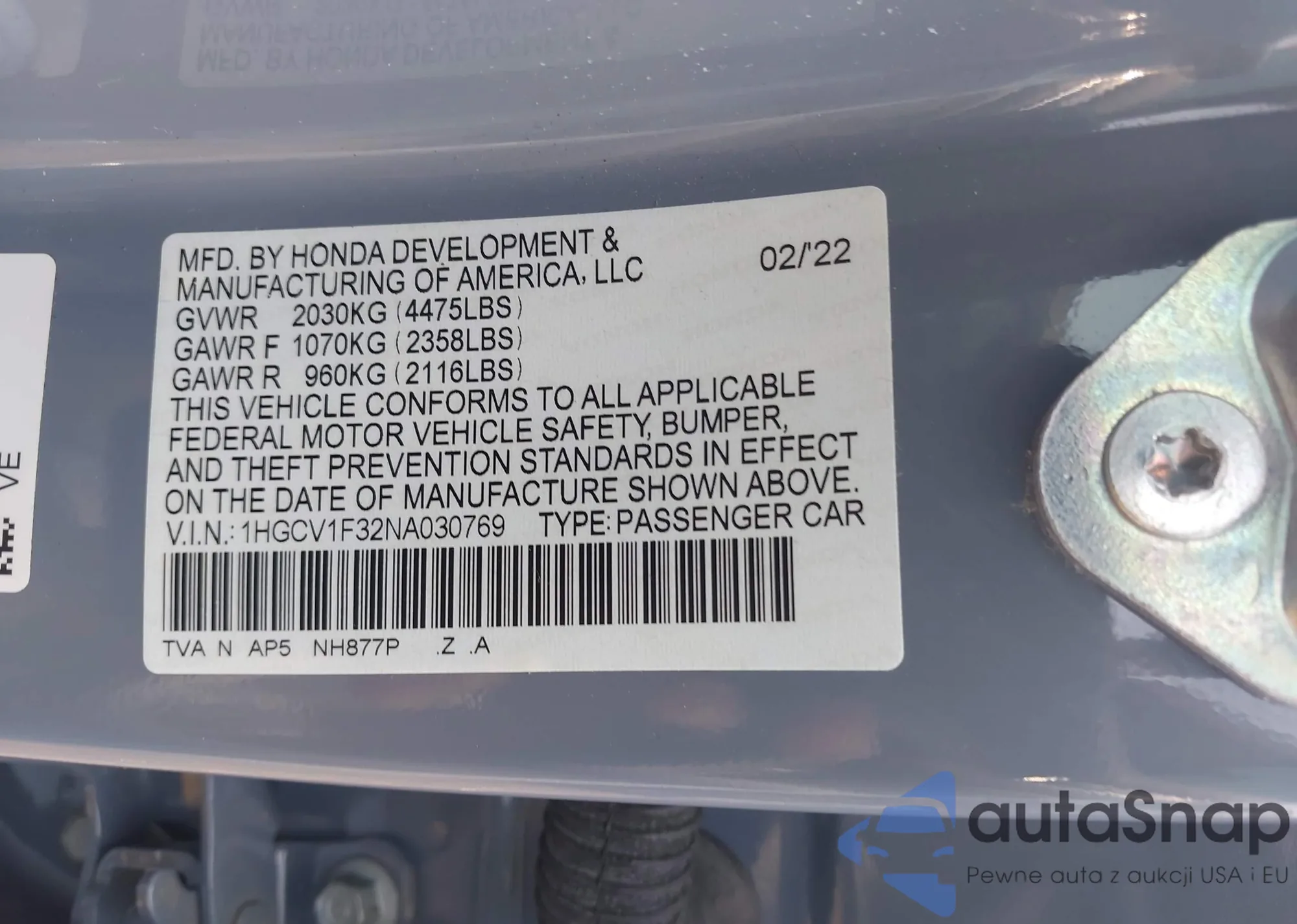 • VIN 1HGCV1F32NA030769