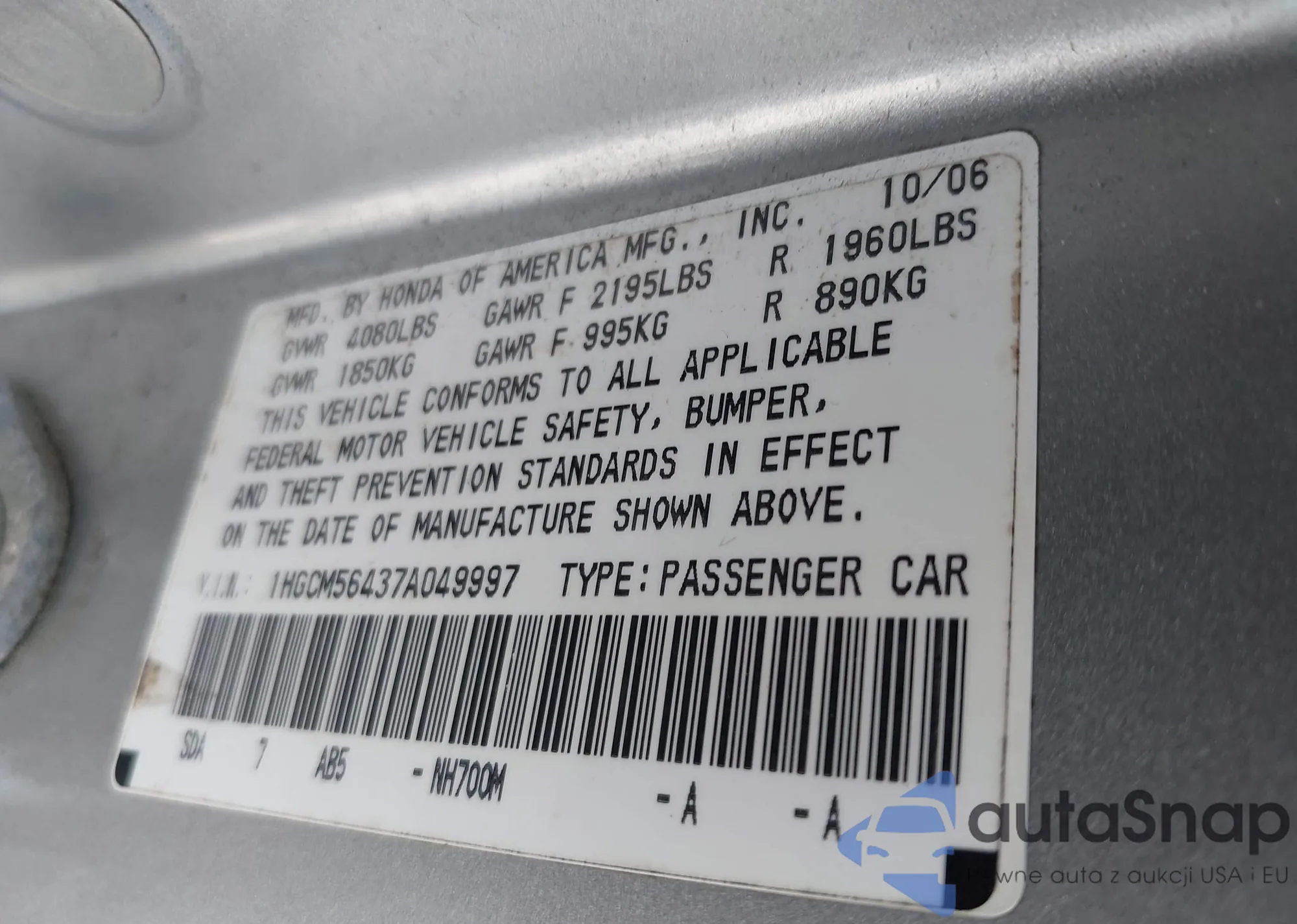 LOT: 42424854 VIN: 1HGCM56437A049997