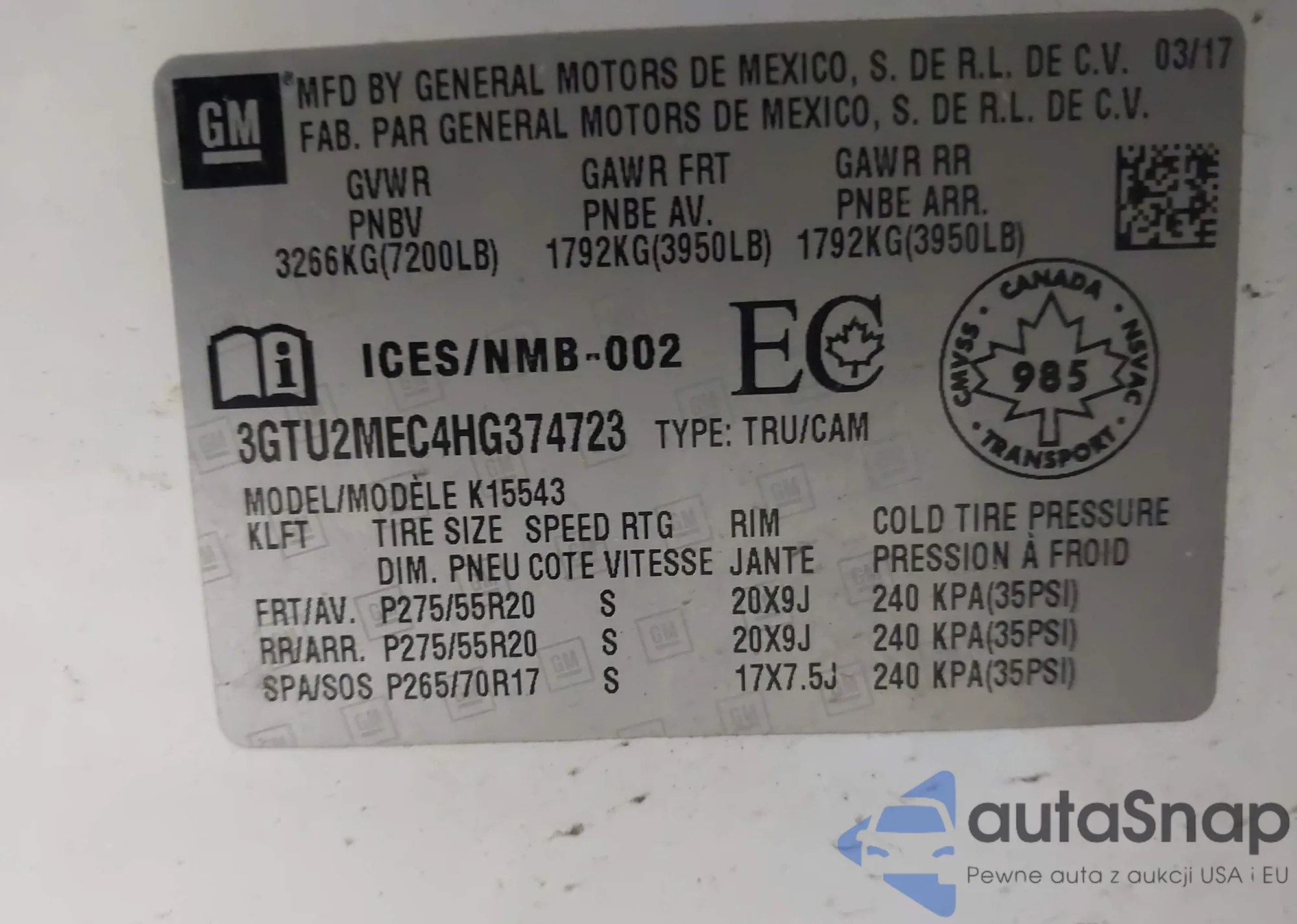• VIN 3GTU2MEC4HG374723
