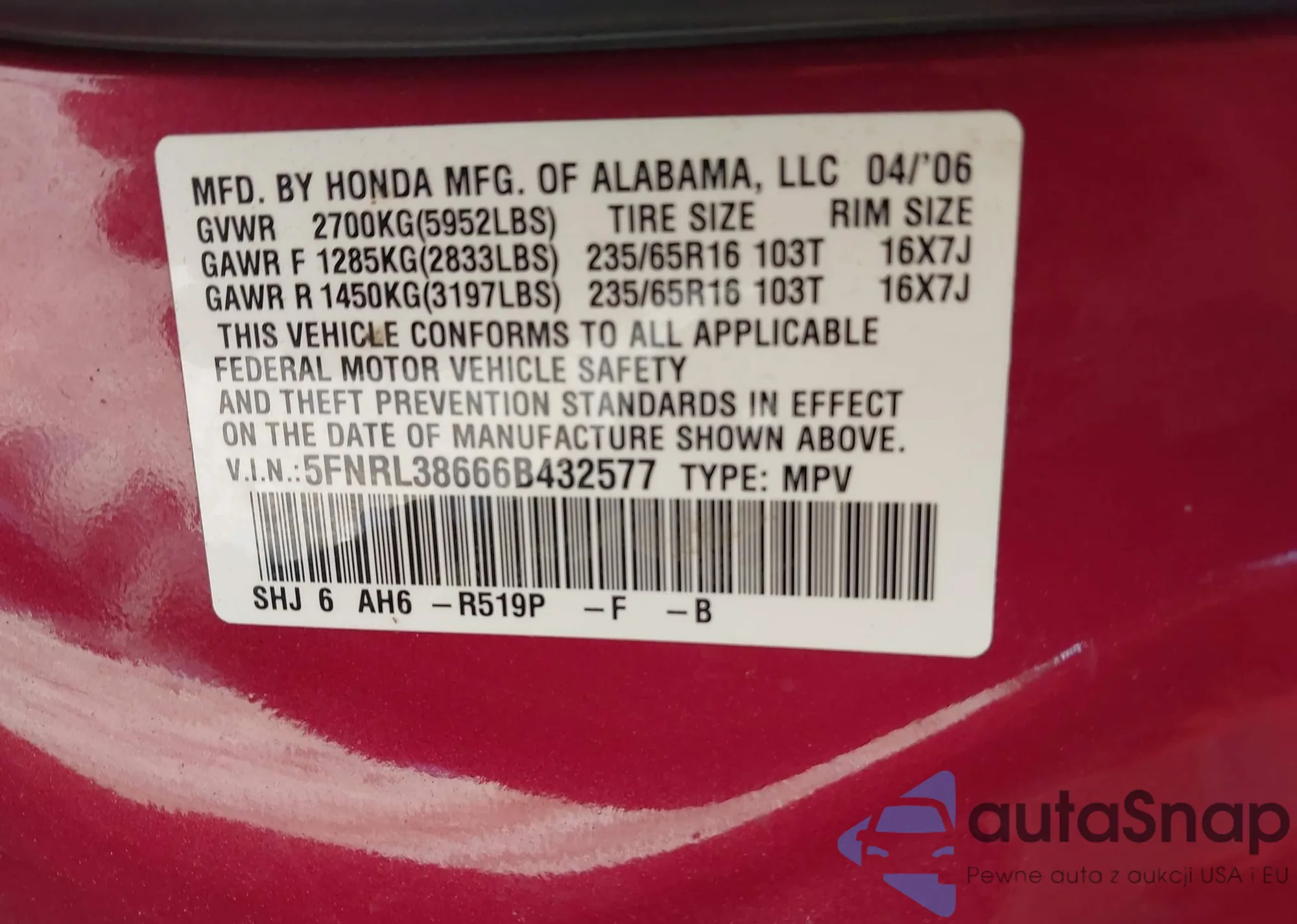 LOT: 42232203 VIN: 5FNRL38666B432577