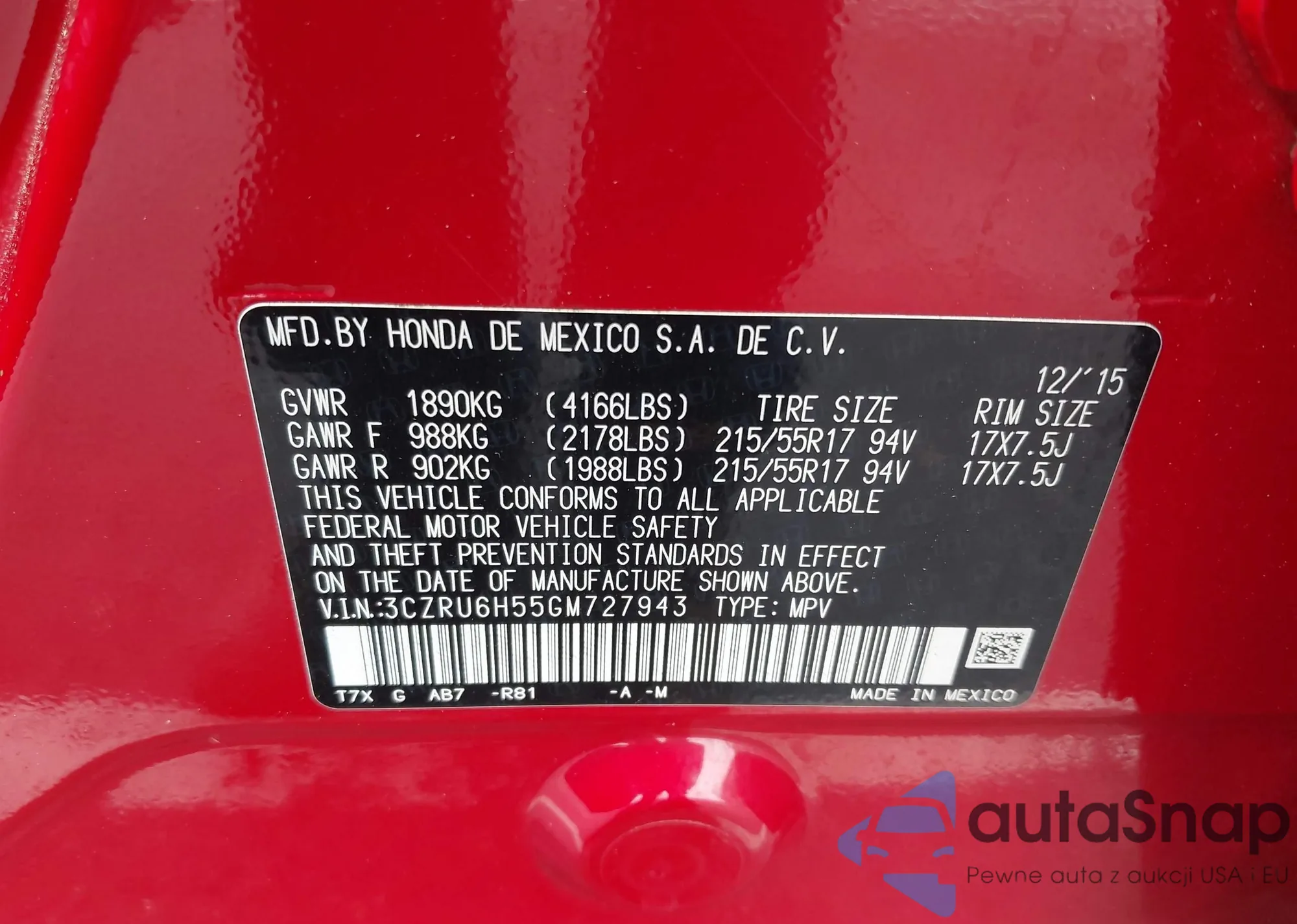 • VIN 3CZRU6H55GM727943