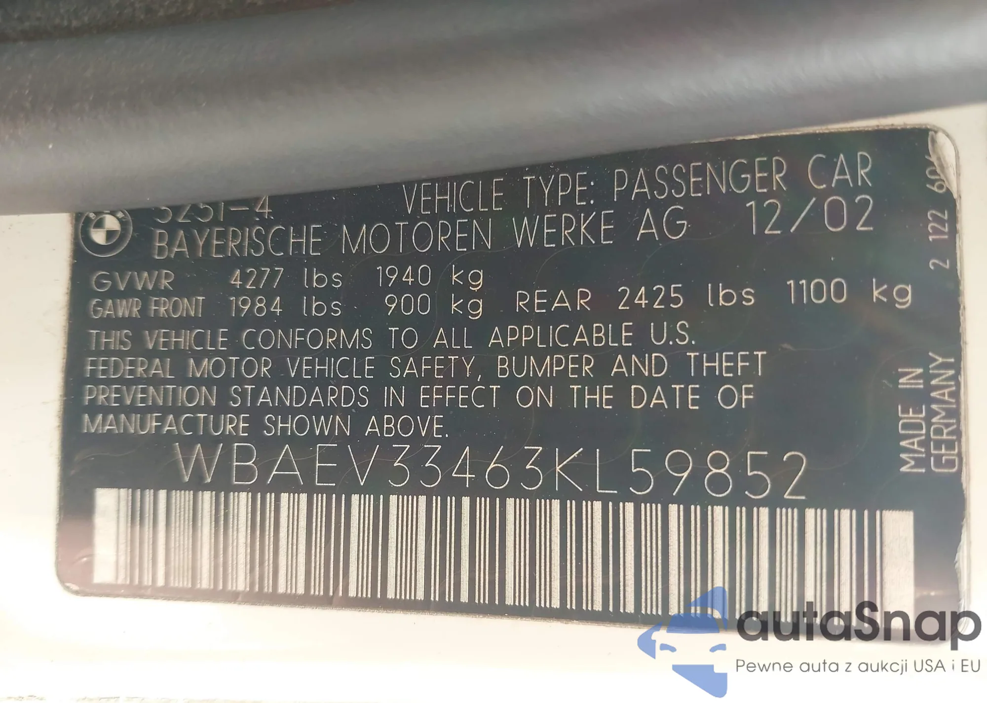 2003 BMW 325 z USA, uszkodzony, nr VIN WBAEV33463KL59852