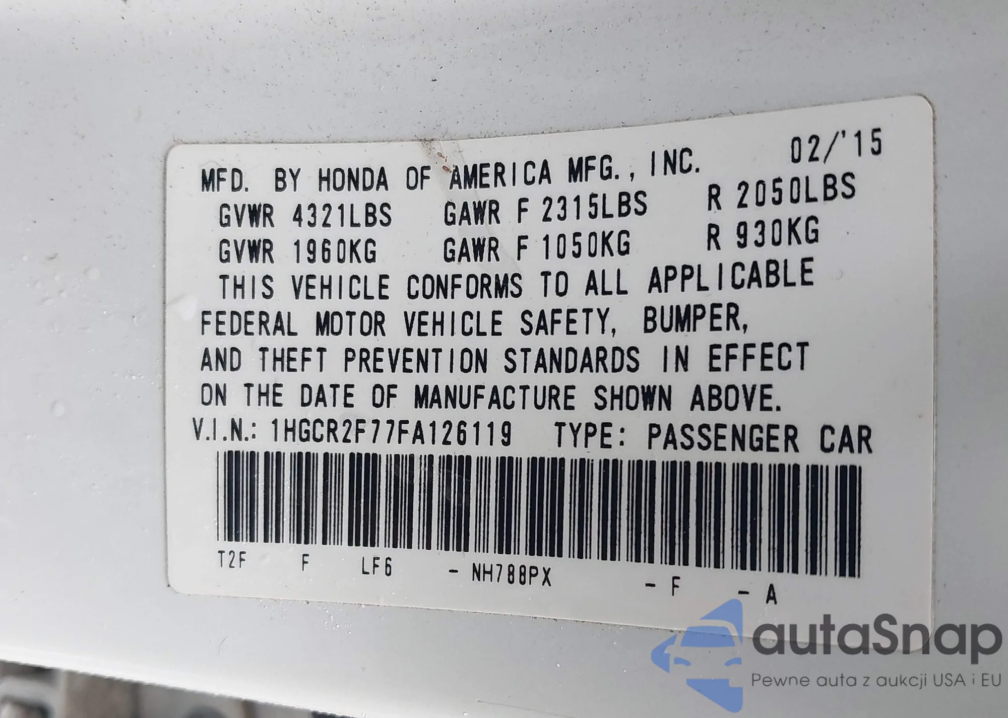 LOT: 42365746 VIN: 1HGCR2F77FA126119