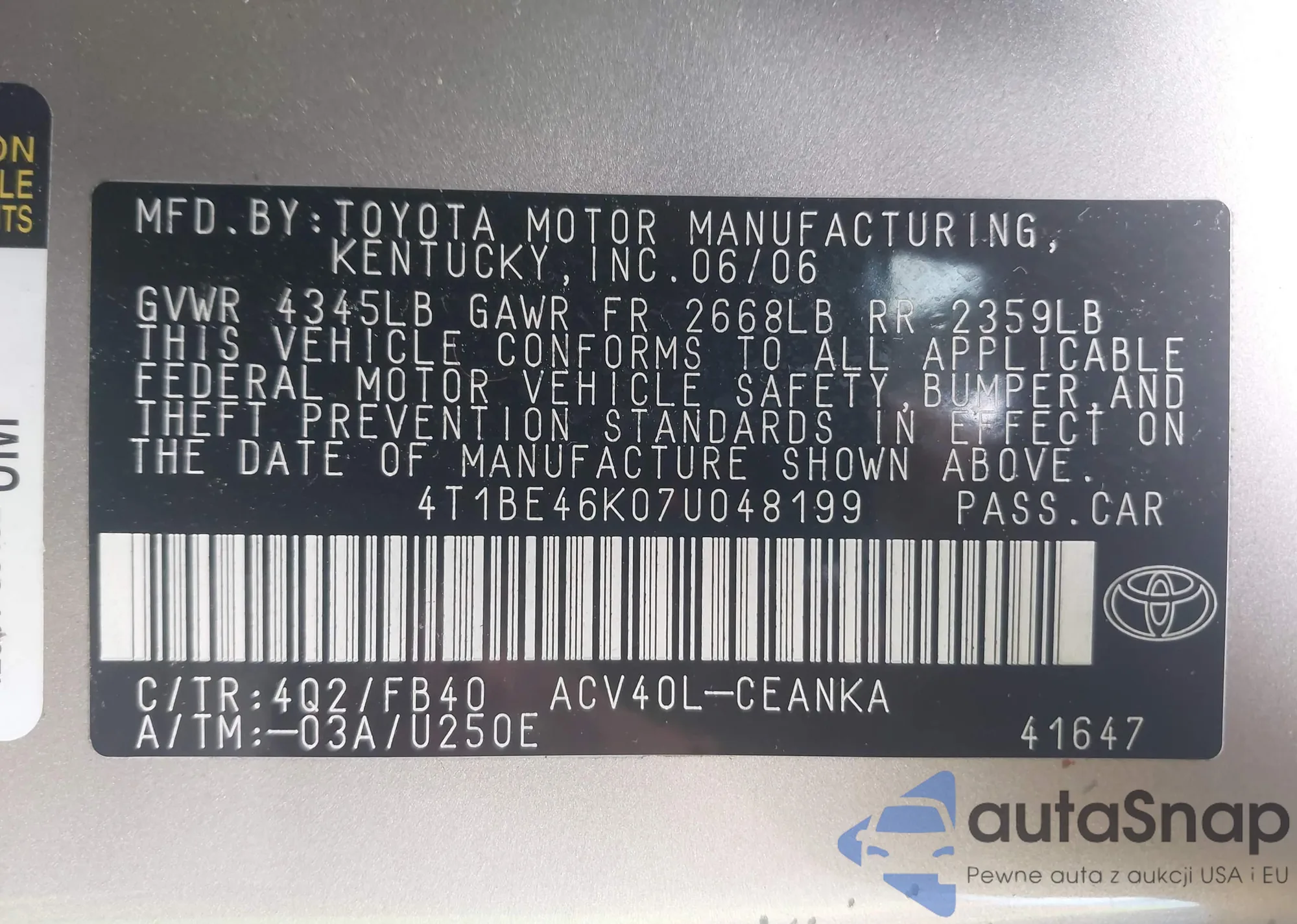 LOT: 42322883 VIN: JT6HT00W9W0007768