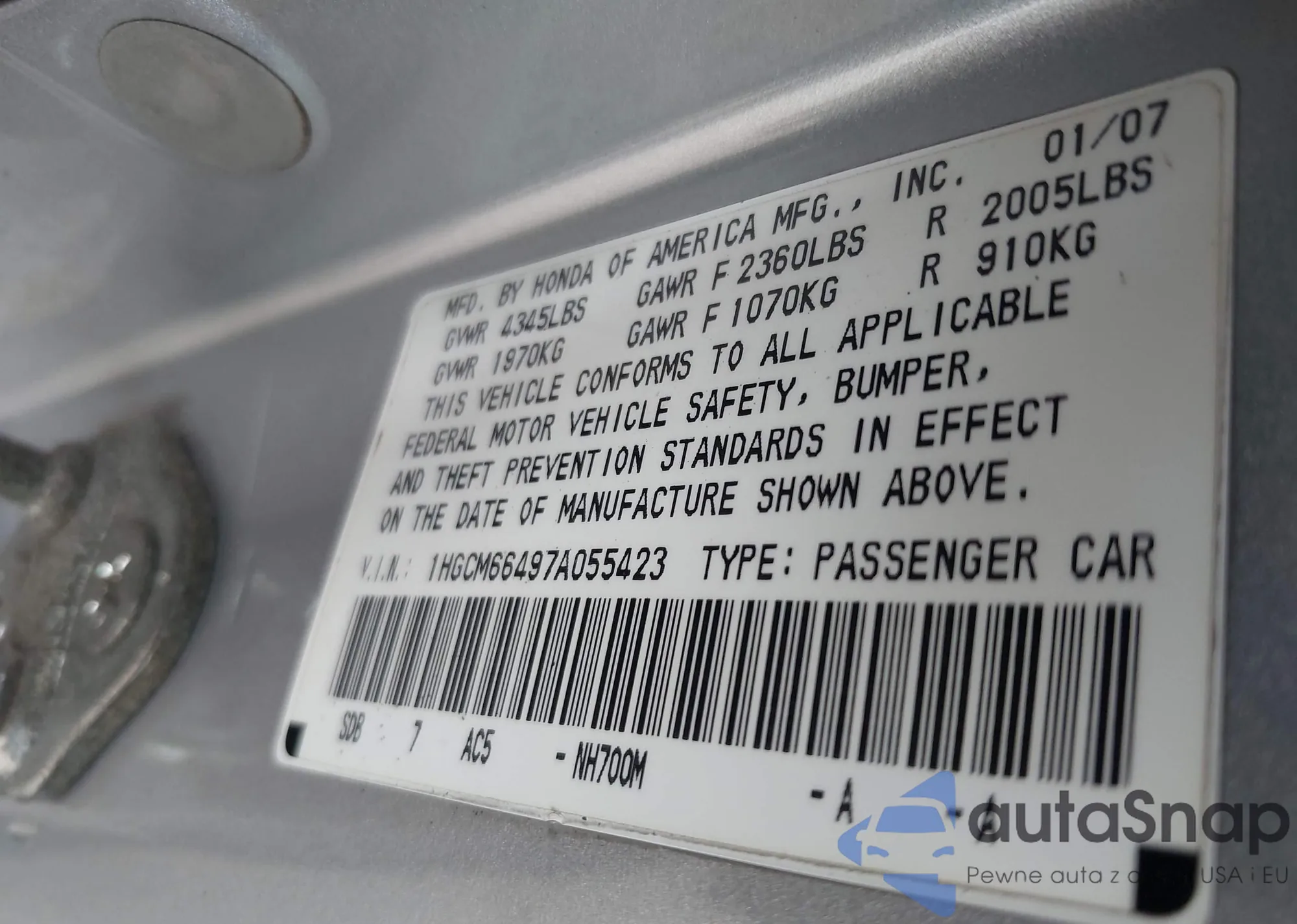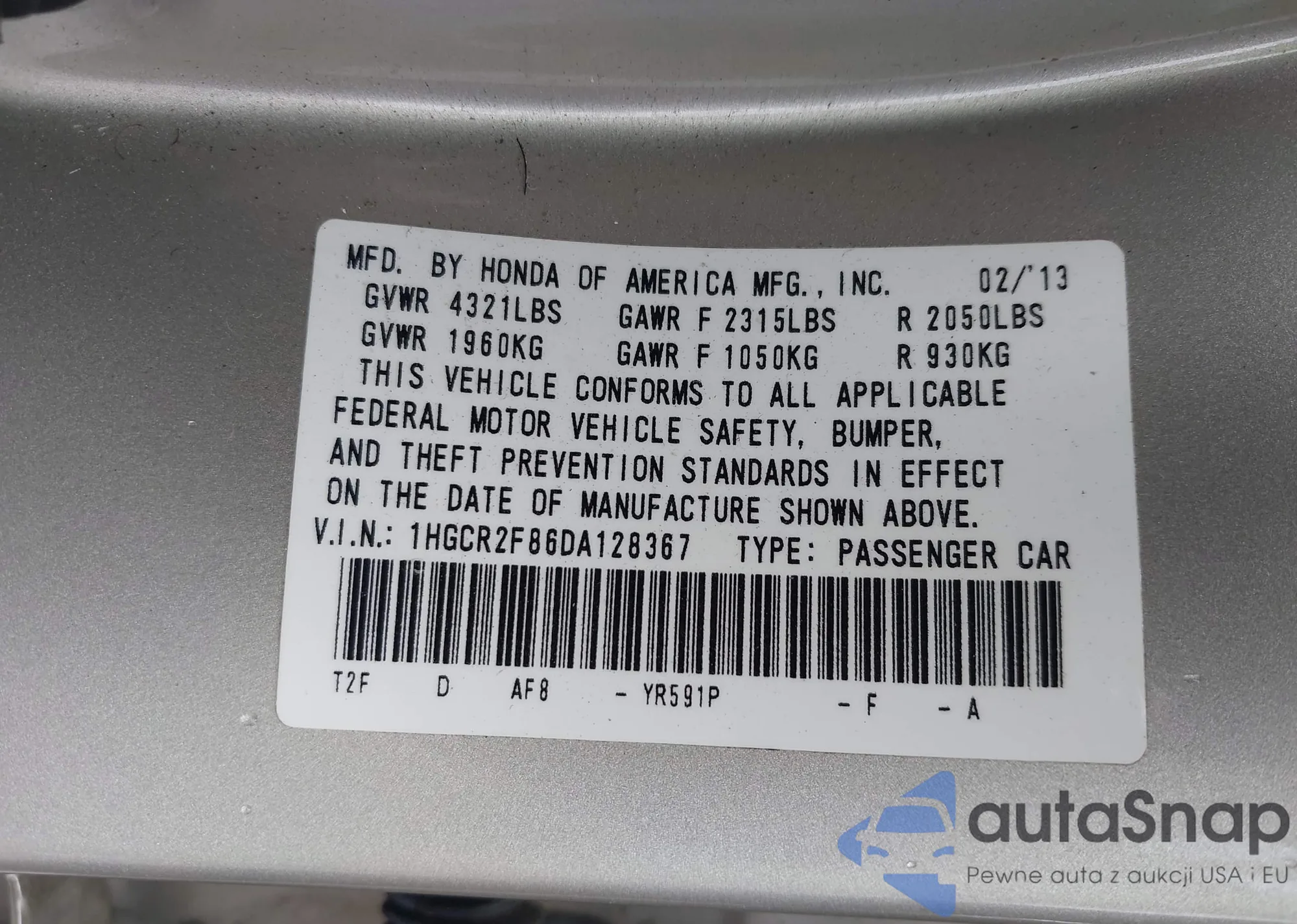 LOT: 42200558 VIN: 1HGCR2F86DA128367