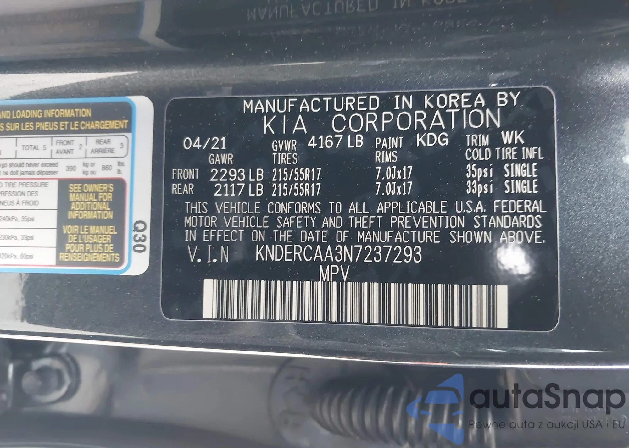 LOT: 42363349 VIN: KNDERCAA3N7237293