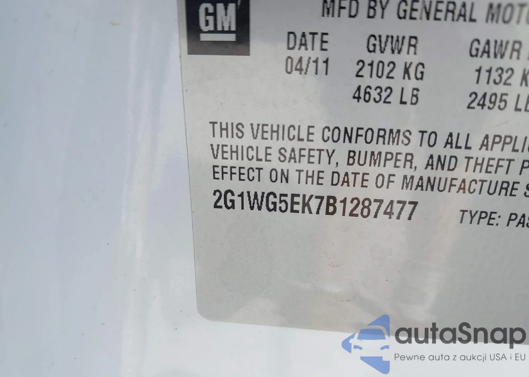 • VIN 2G1WG5EK7B1287477