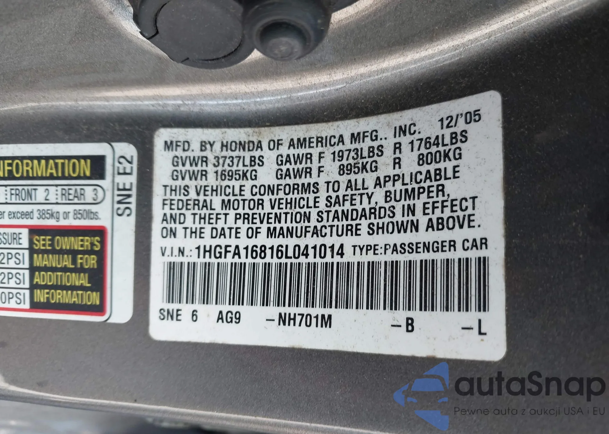 LOT: 42290503 VIN: 1HGFA16816L041014