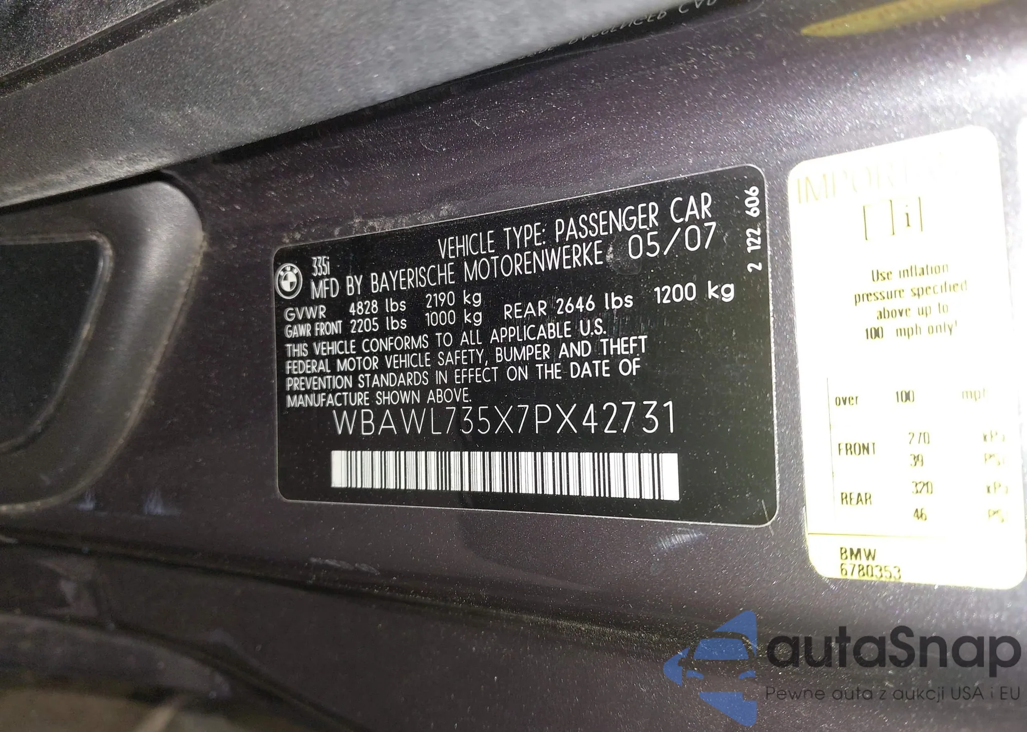 LOT: 42362319 VIN: WBAWL735X7PX42731