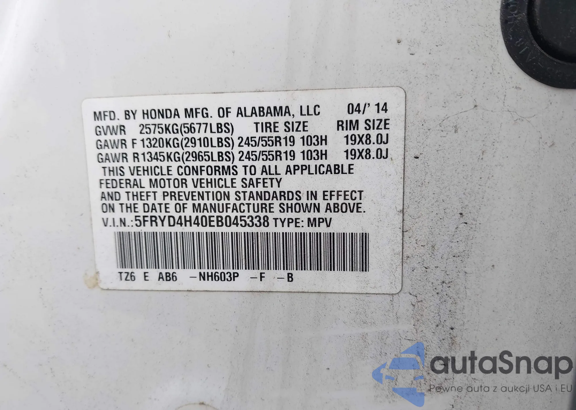 • VIN 5FRYD4H40EB045338