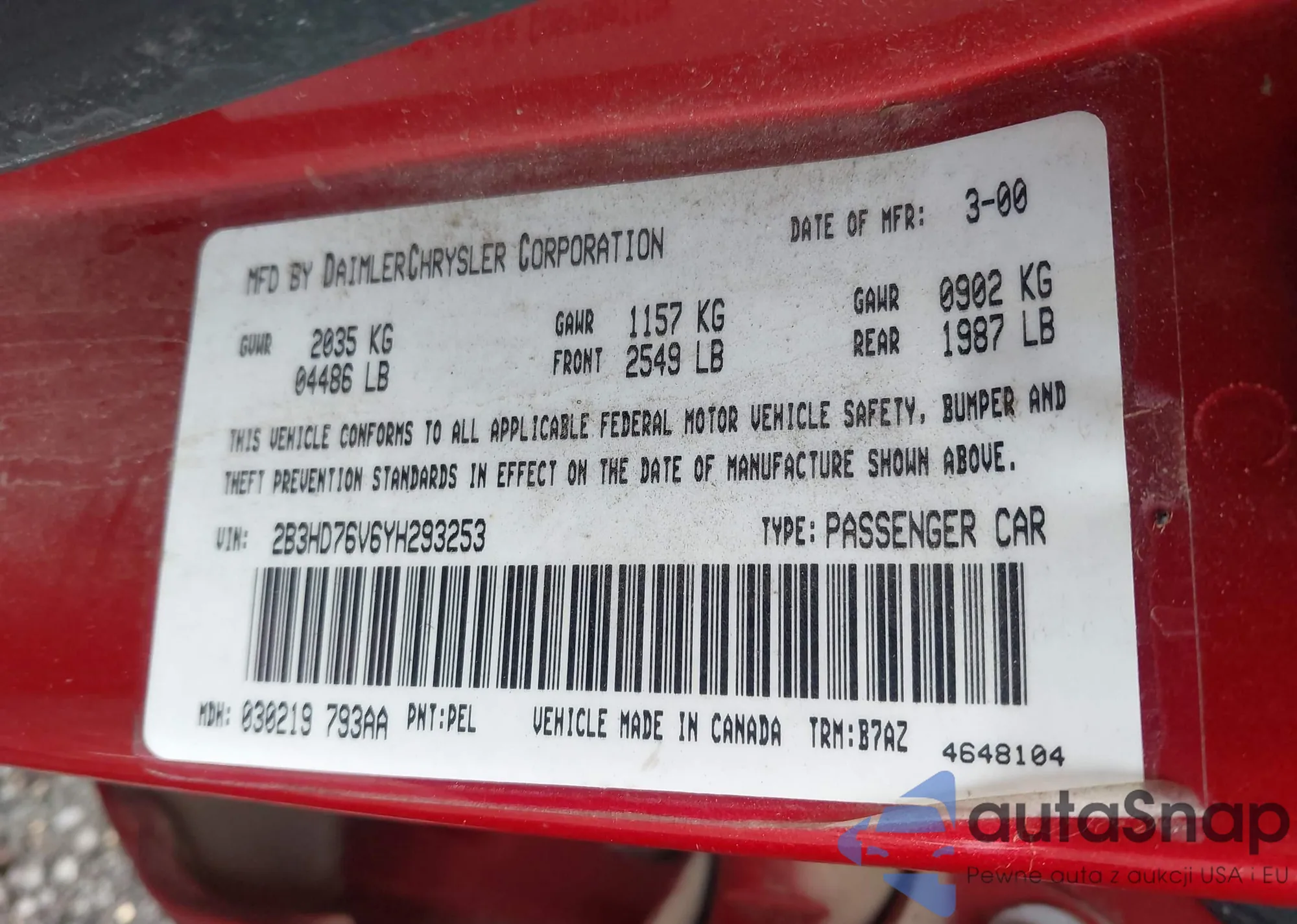 • VIN 2B3HD76V6YH293253