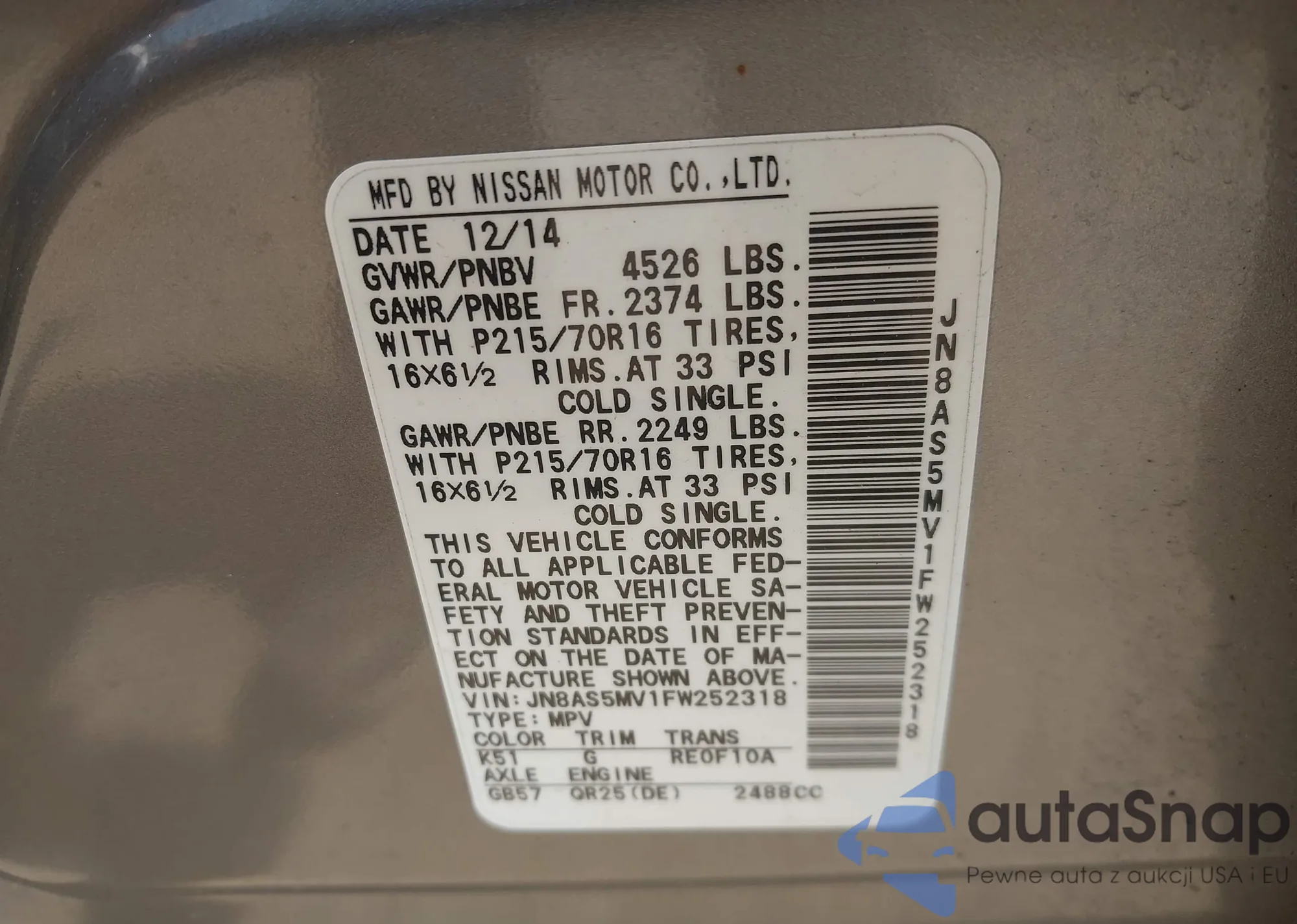 LOT: 42483611 VIN: JN8AS5MV1FW252318