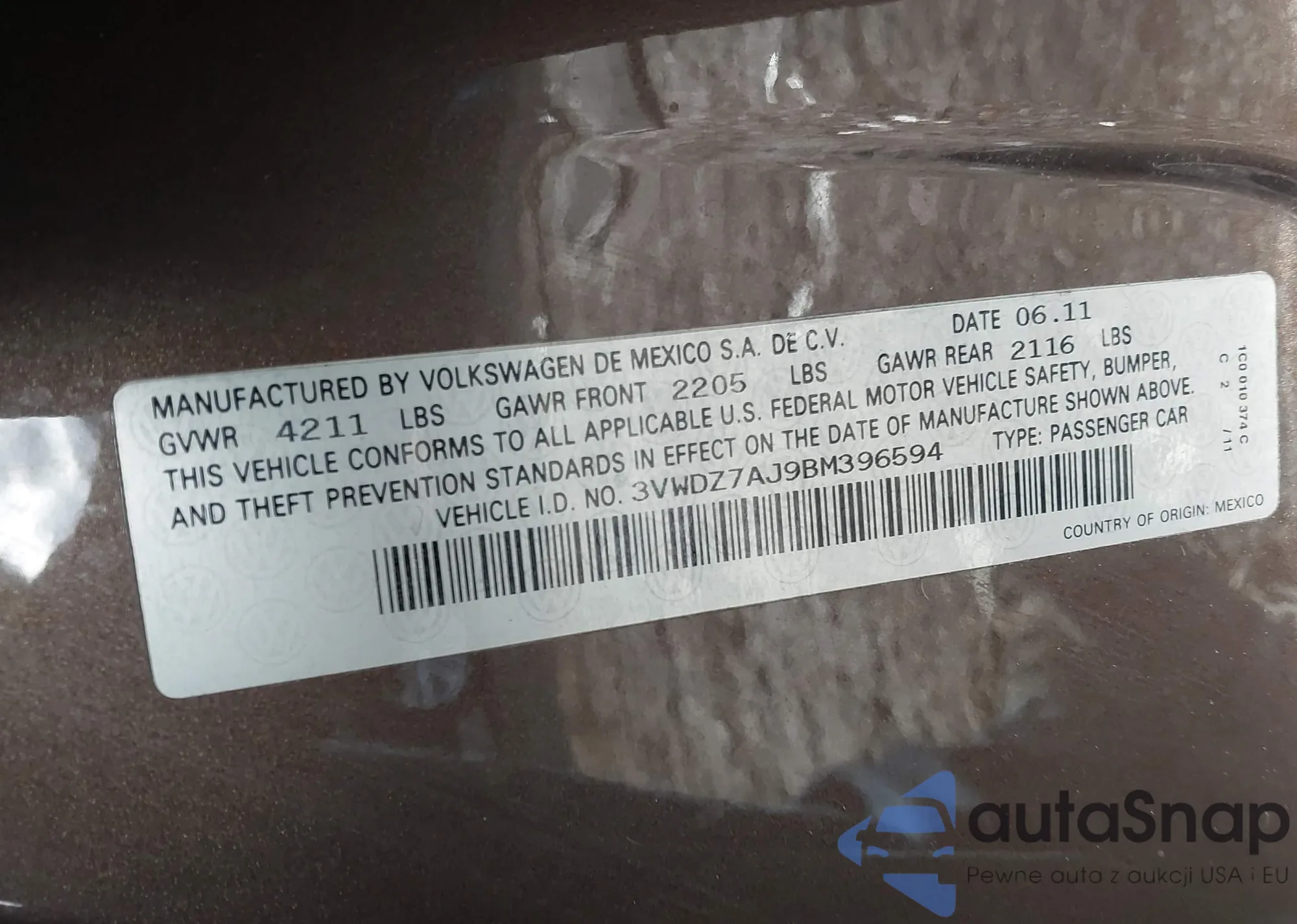 • VIN 3VWDZ7AJ9BM396594