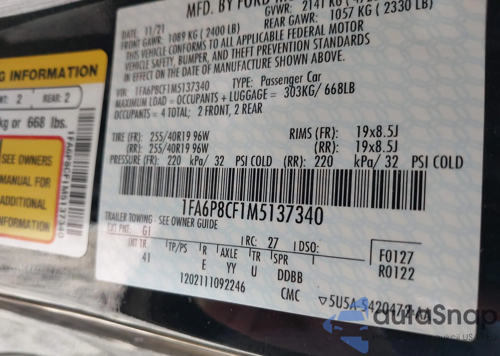 LOT: 42196670 VIN: 1FA6P8CF1M5137340