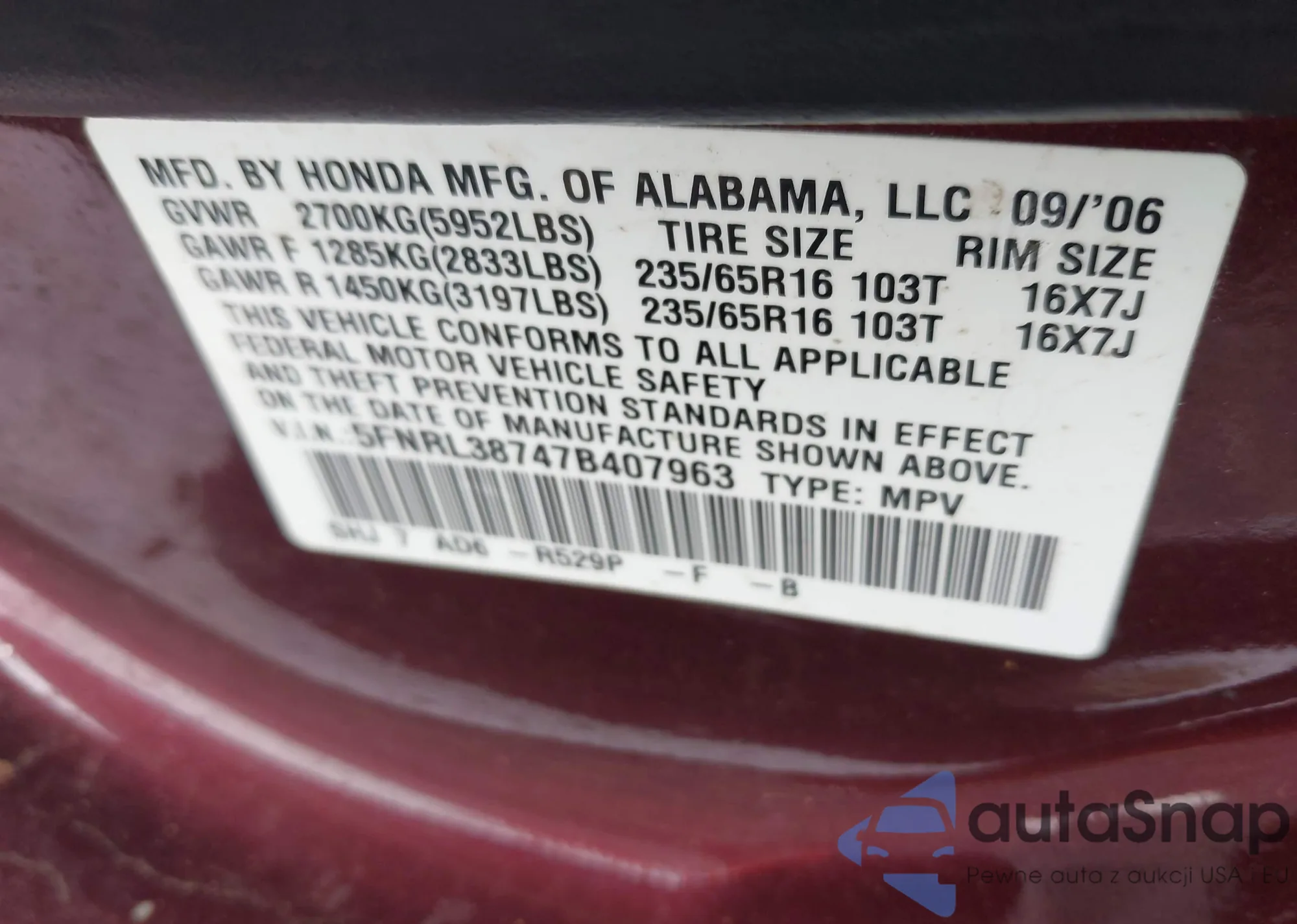 • VIN 2HKRL18982H553010