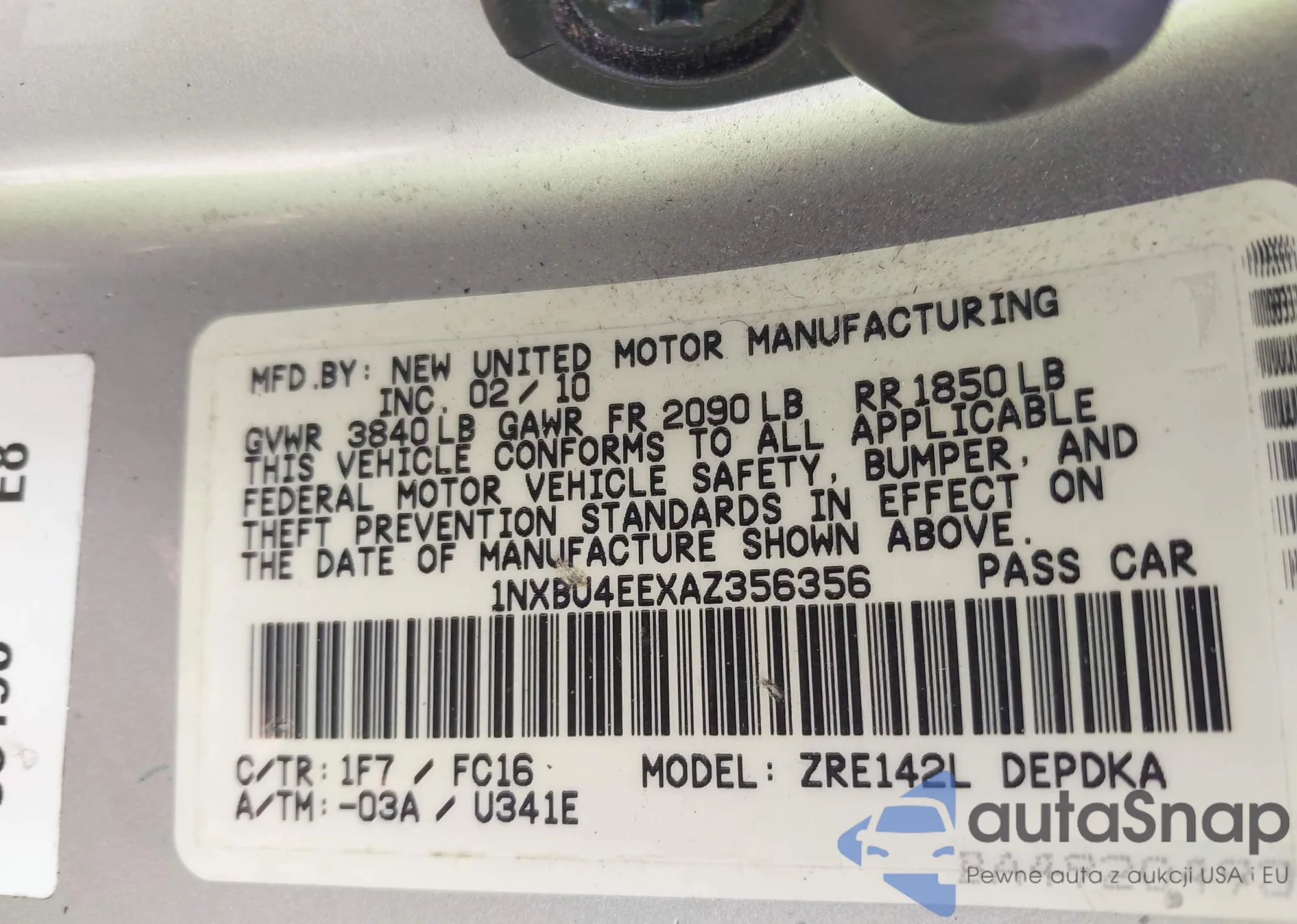 • VIN 1NXBU4EEXAZ356356