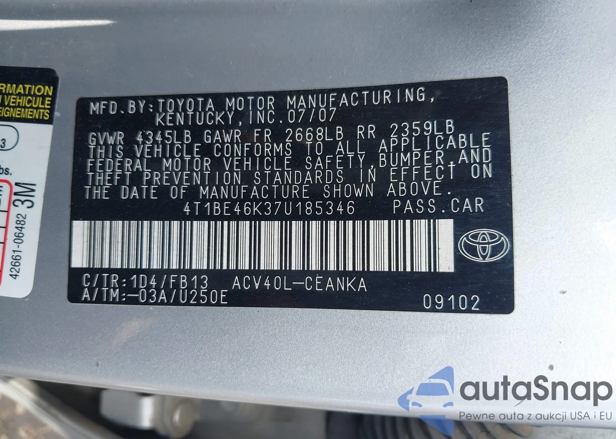 LOT: 42324678 VIN: 4T1BE46K37U185346