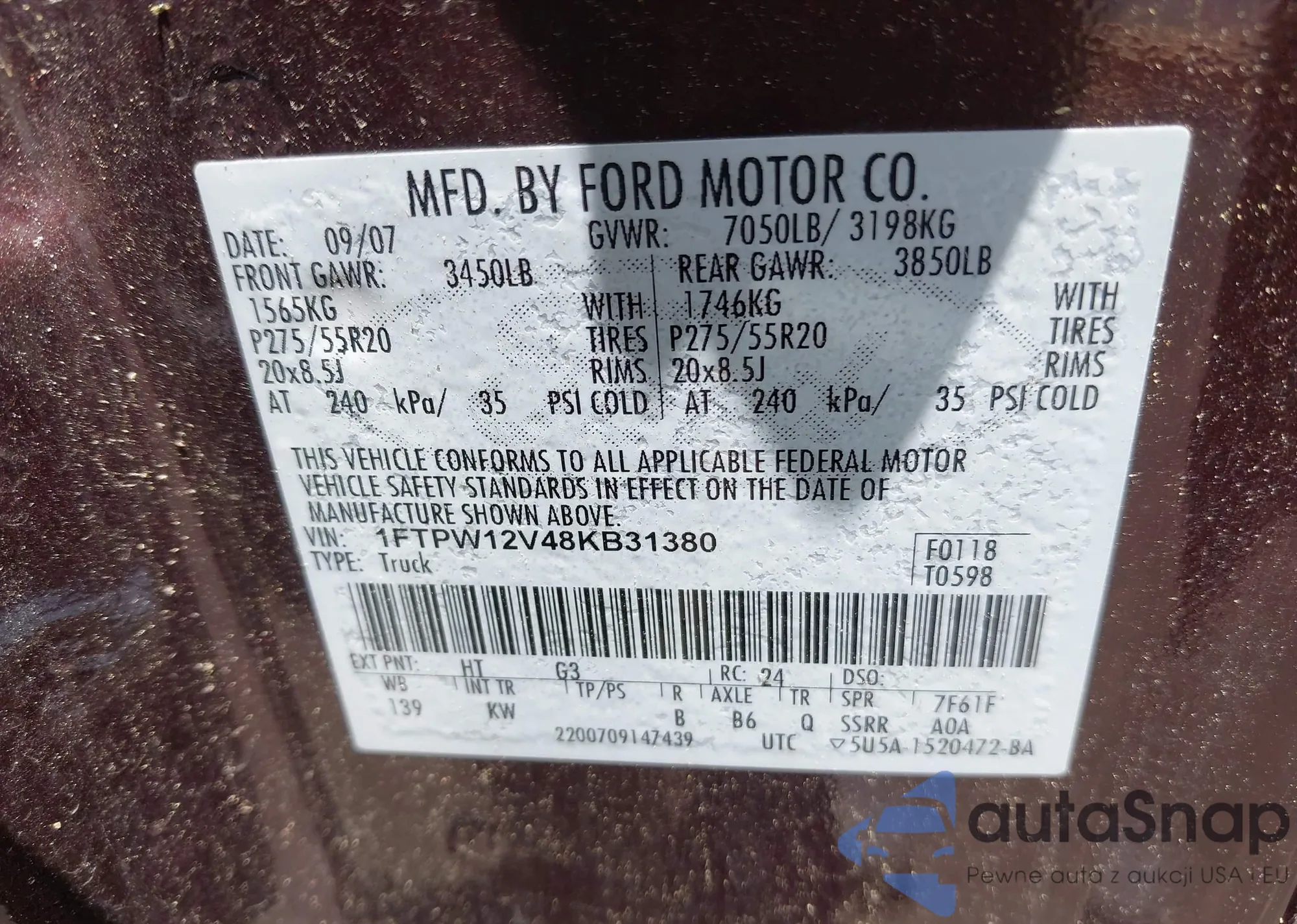 • VIN 1FTPW12V48KB31380