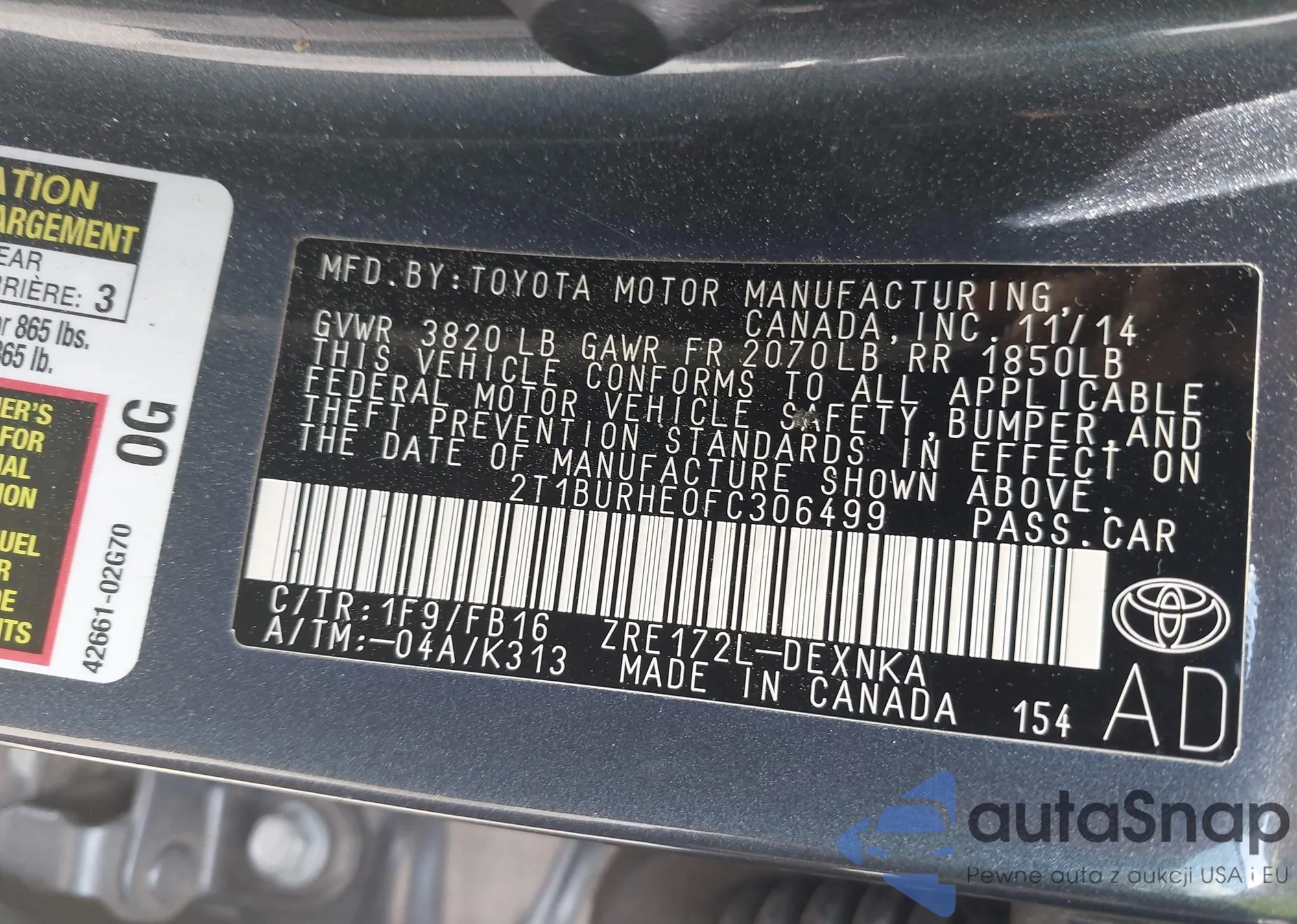 LOT: 42205593 VIN: 2T1BURHE0FC306499