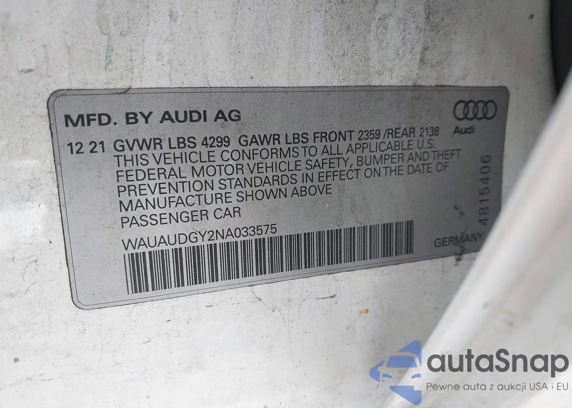 LOT: 42112827 VIN: WAUAUDGY2NA033575