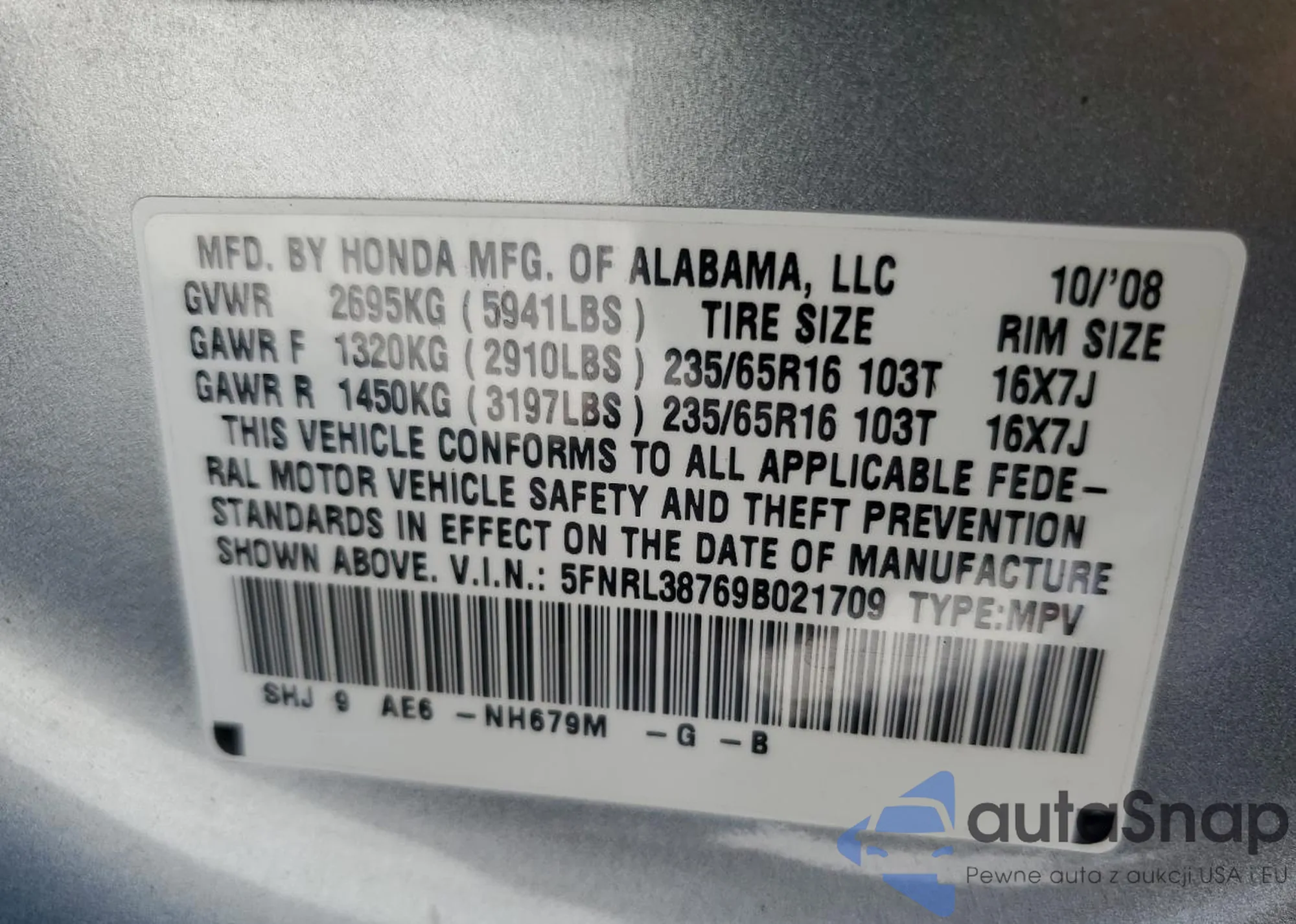 • VIN 1HGCV1F59MA085431