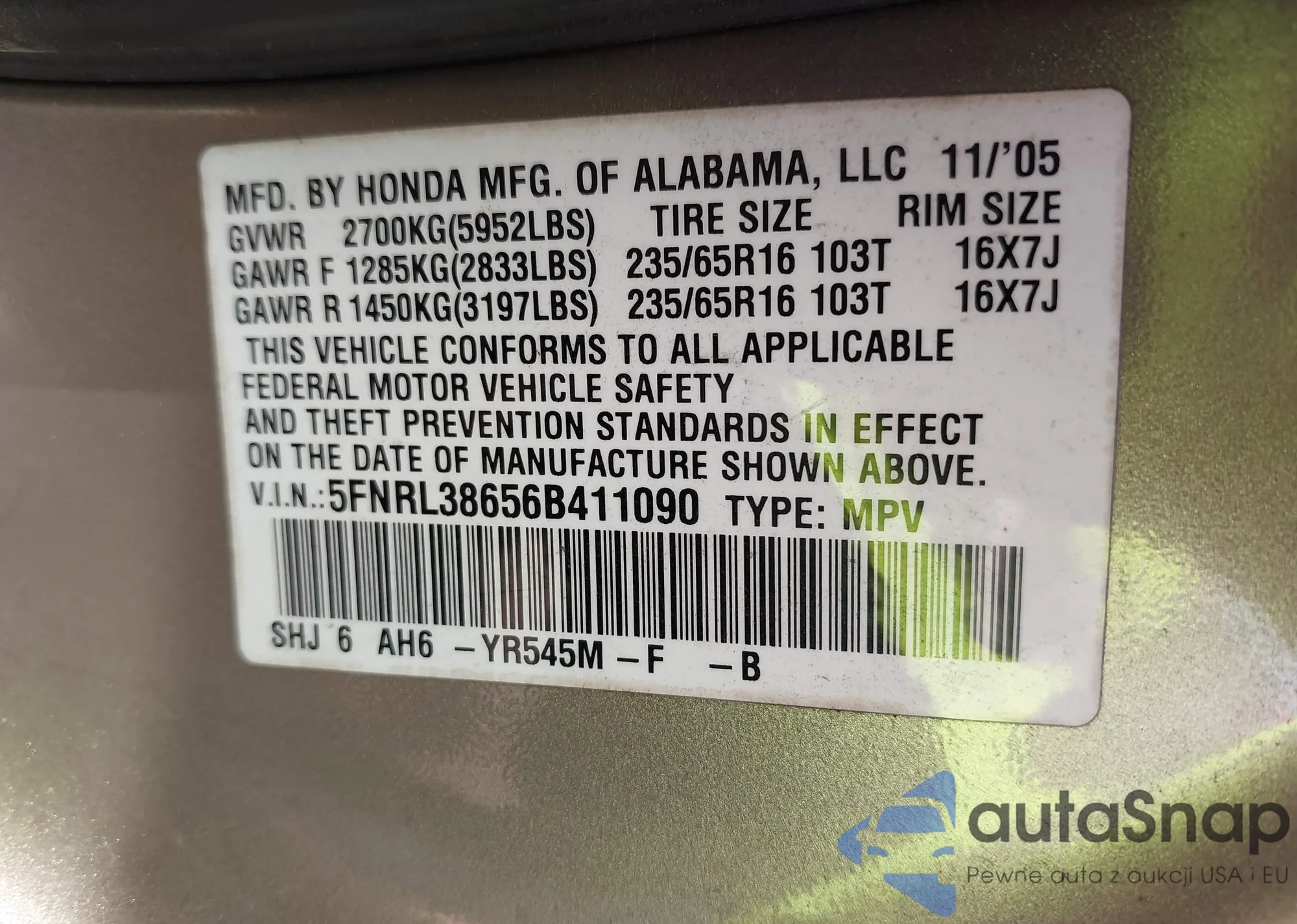 • VIN 5FNRL38656B411090
