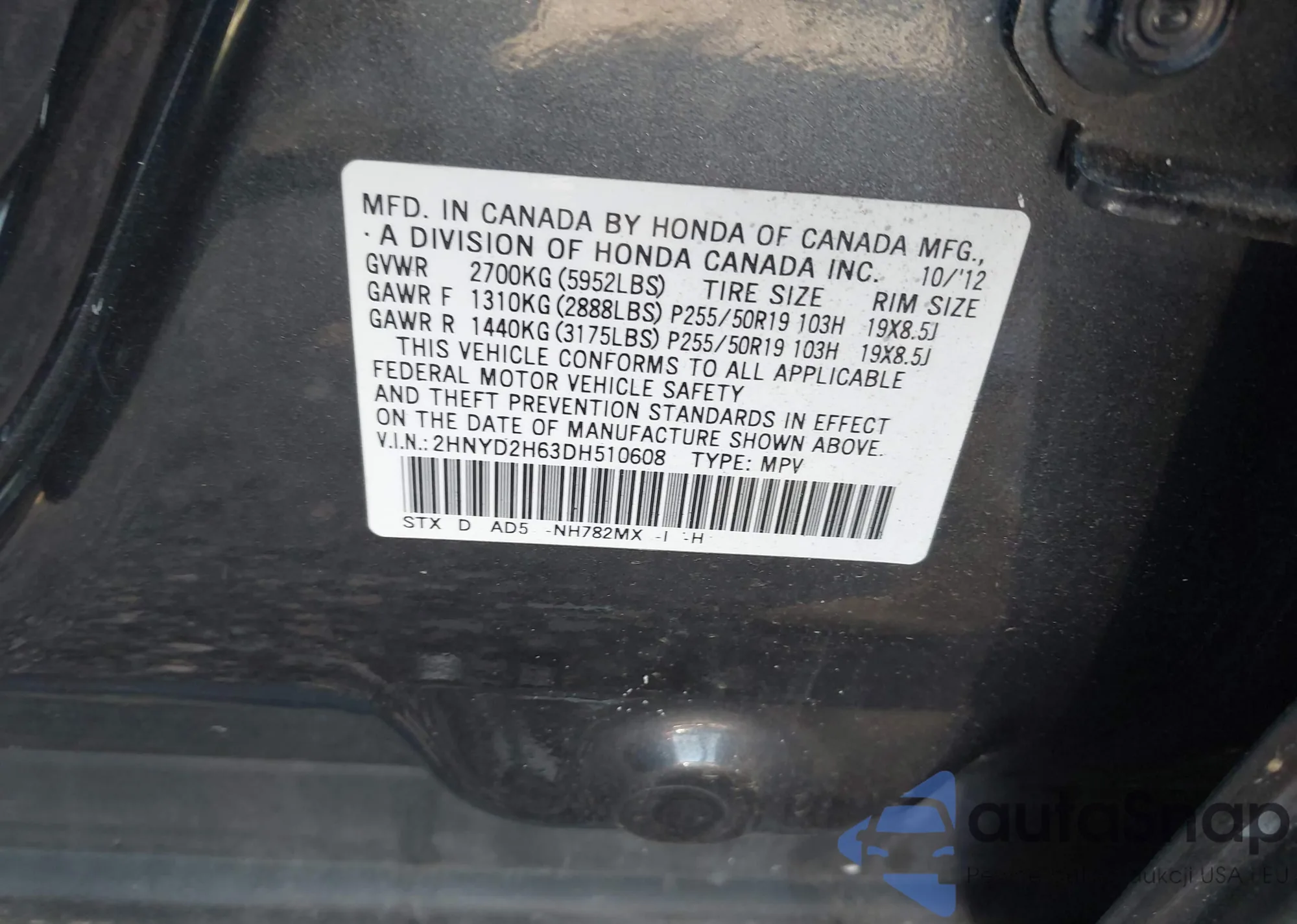 • VIN 2HNYD2H63DH510608