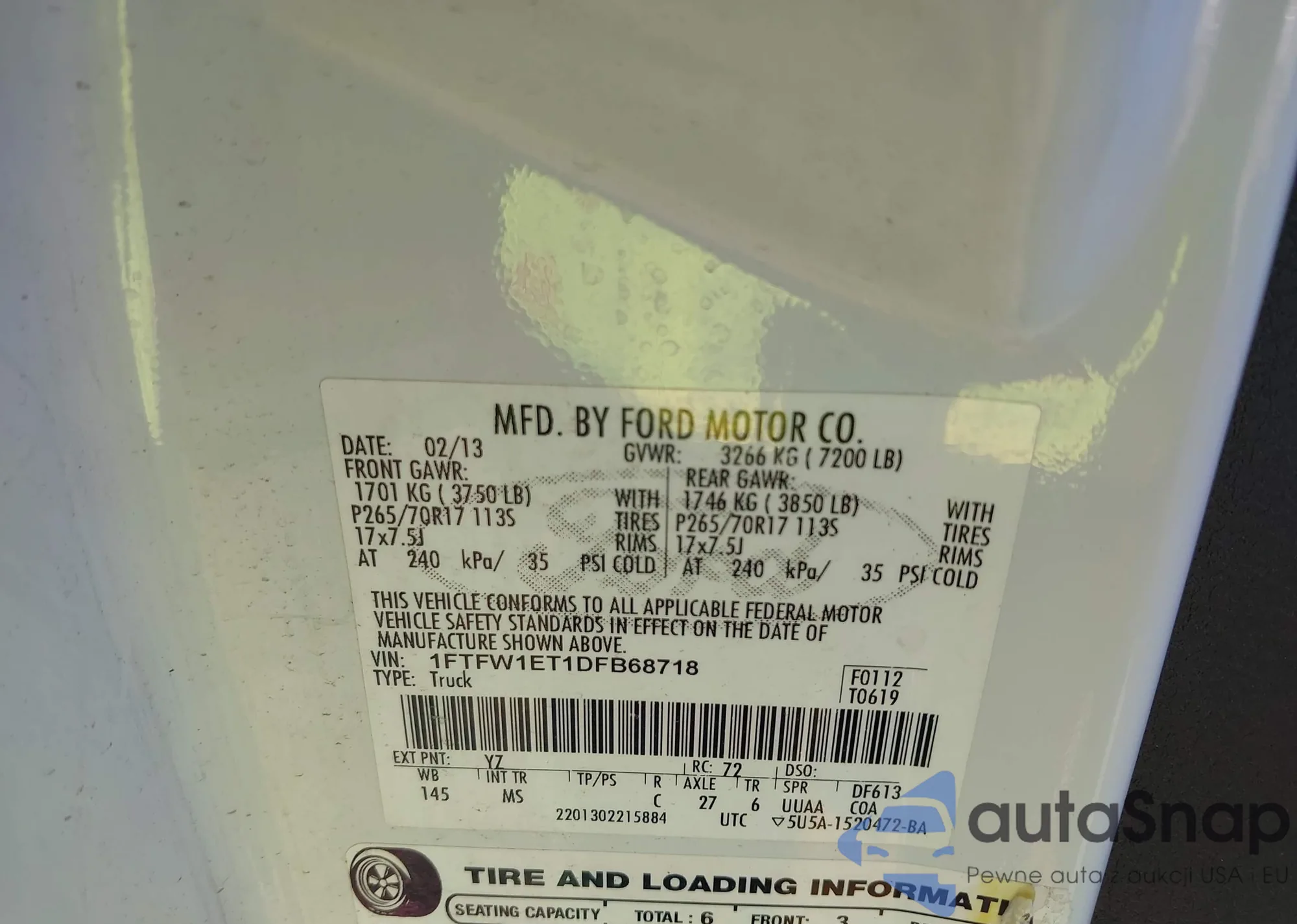 LOT: 42479767 VIN: 1FTFW1ET1DFB68718