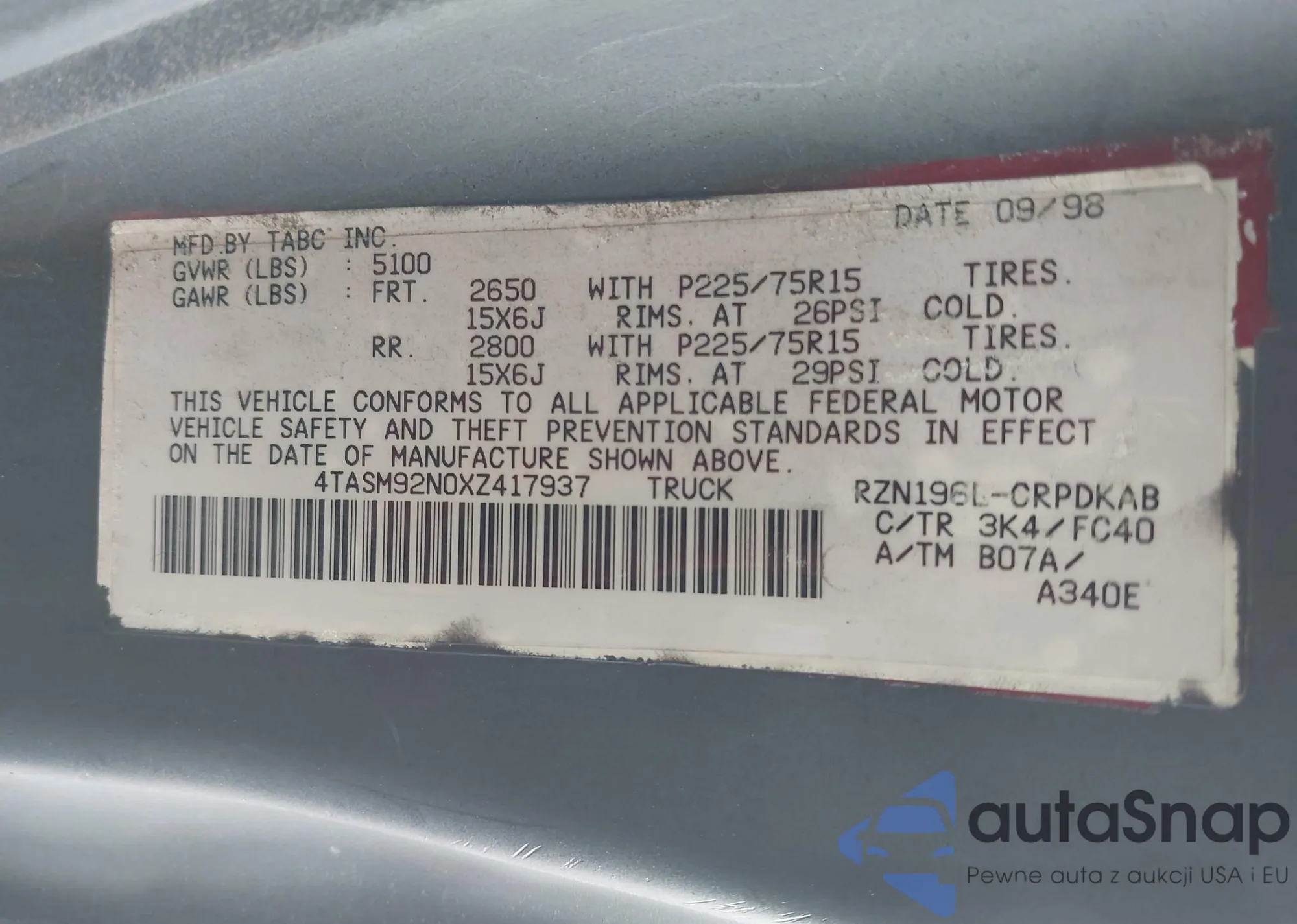 • VIN 4TASM92N0XZ417937