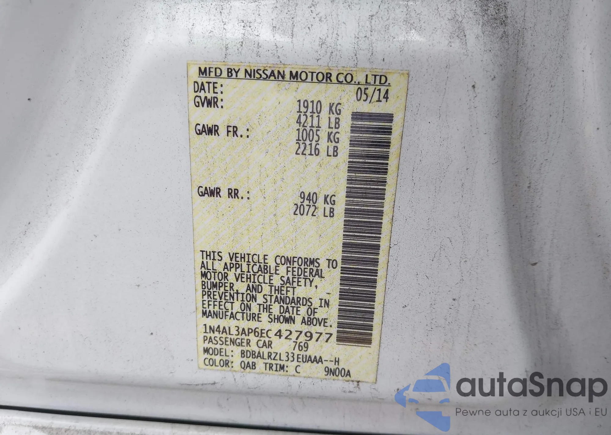 • VIN 1N4AL3AP6EC427977