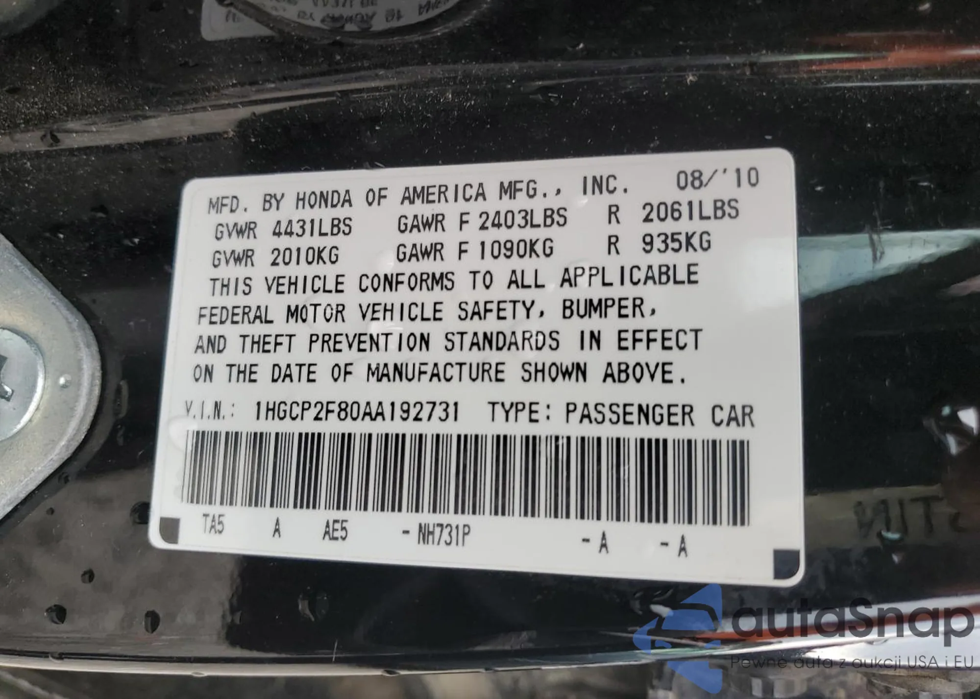LOT: 57413525 VIN: 1HGCP2F80AA192731