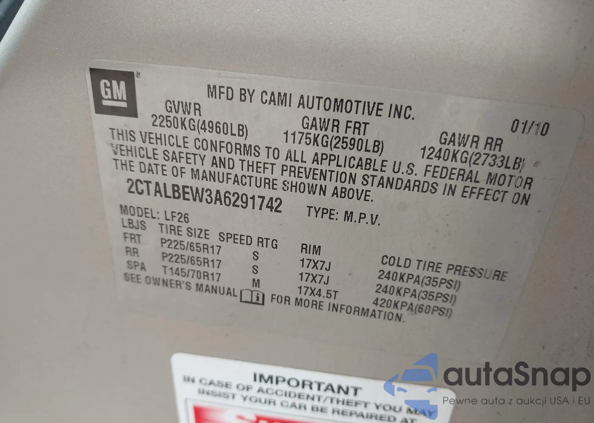 LOT: 42231927 VIN: 1FAHP3FN6AW284998