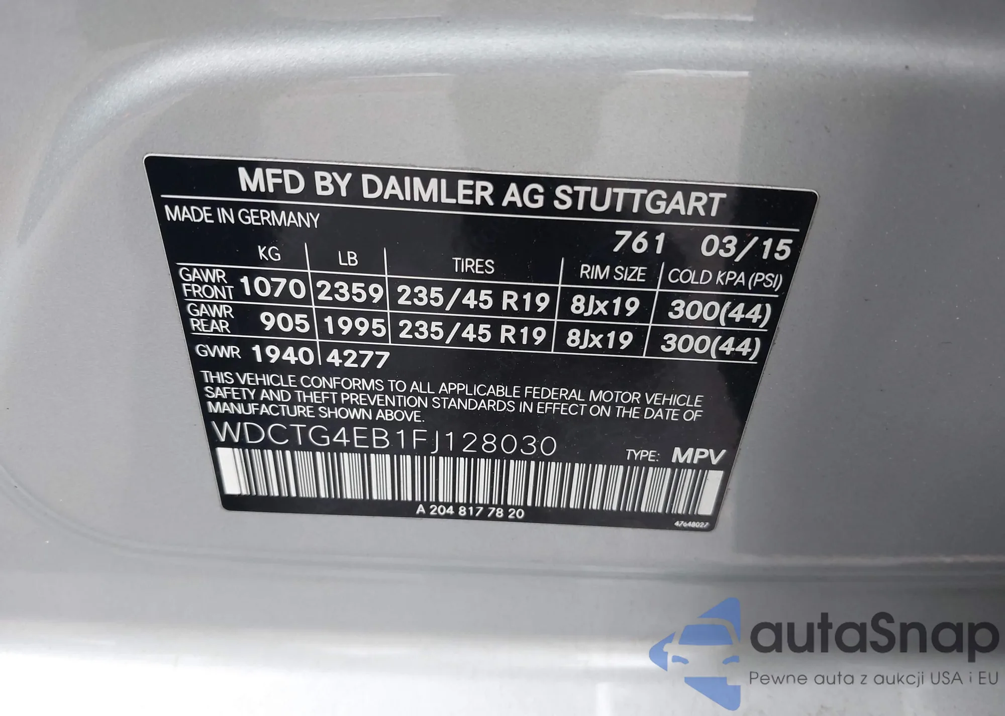 LOT: 42222929 VIN: WDCTG4EB1FJ128030
