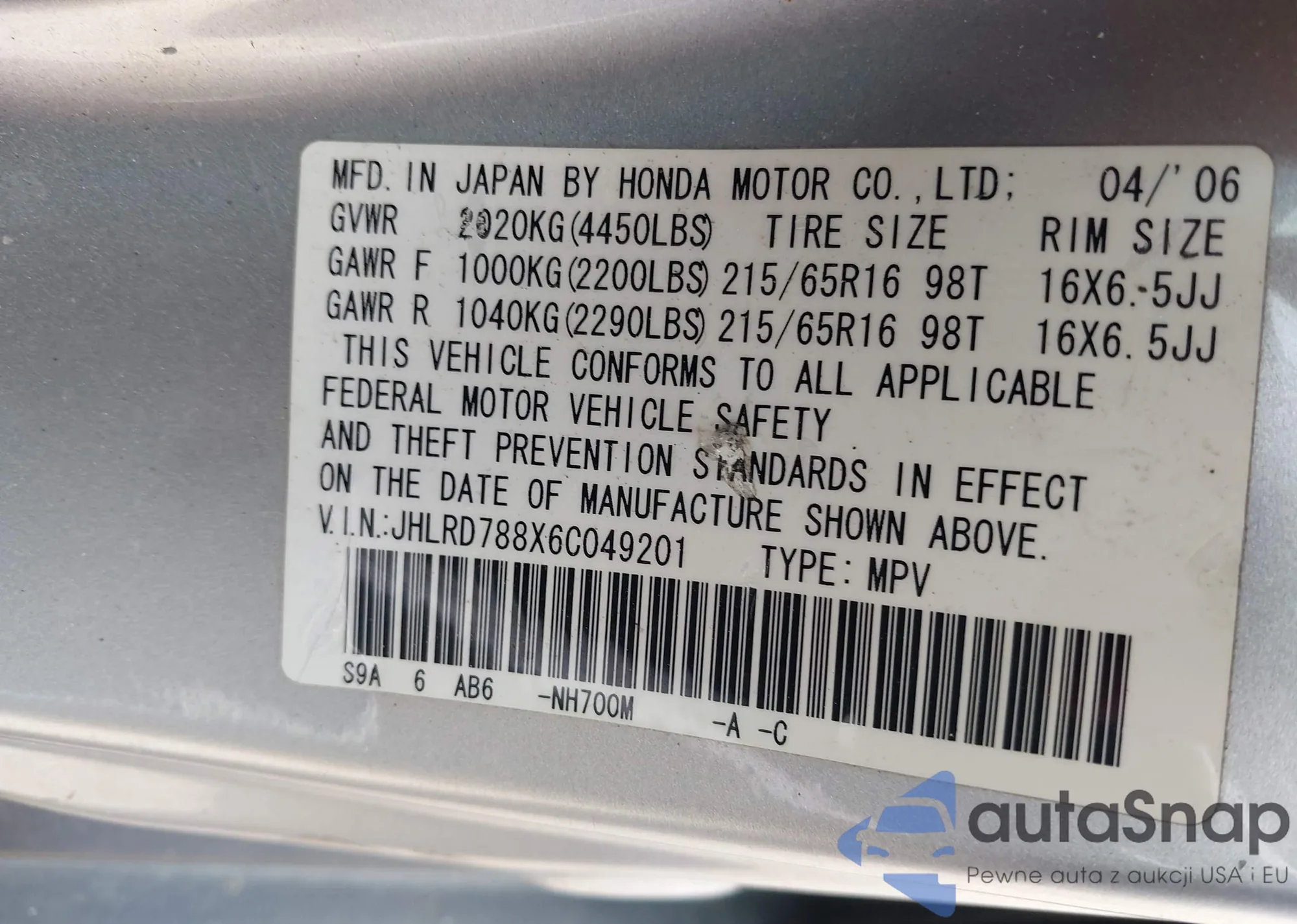LOT: 42344801 VIN: JHLRD788X6C049201