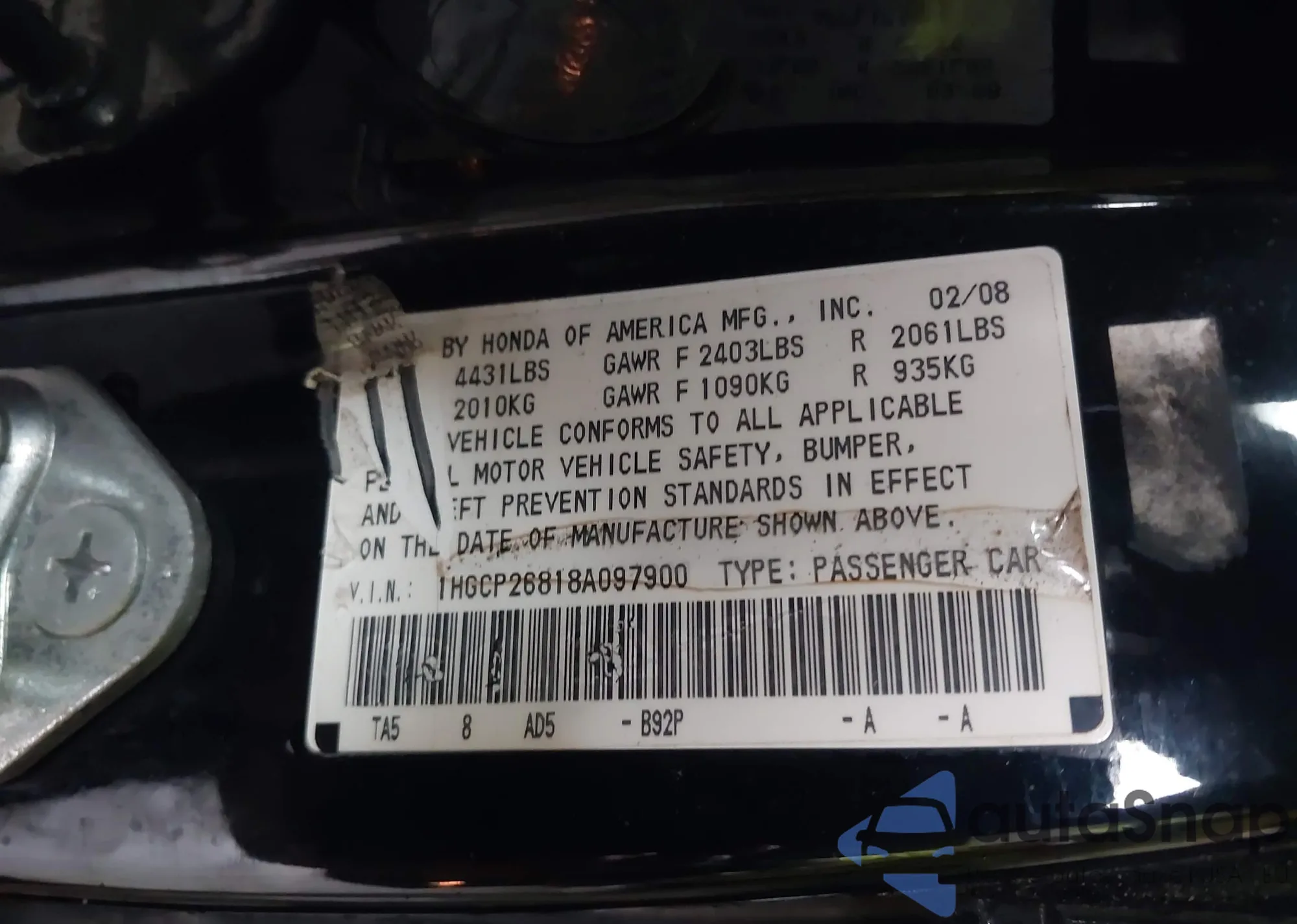 LOT: 42374866 VIN: 1HGCP26818A097900