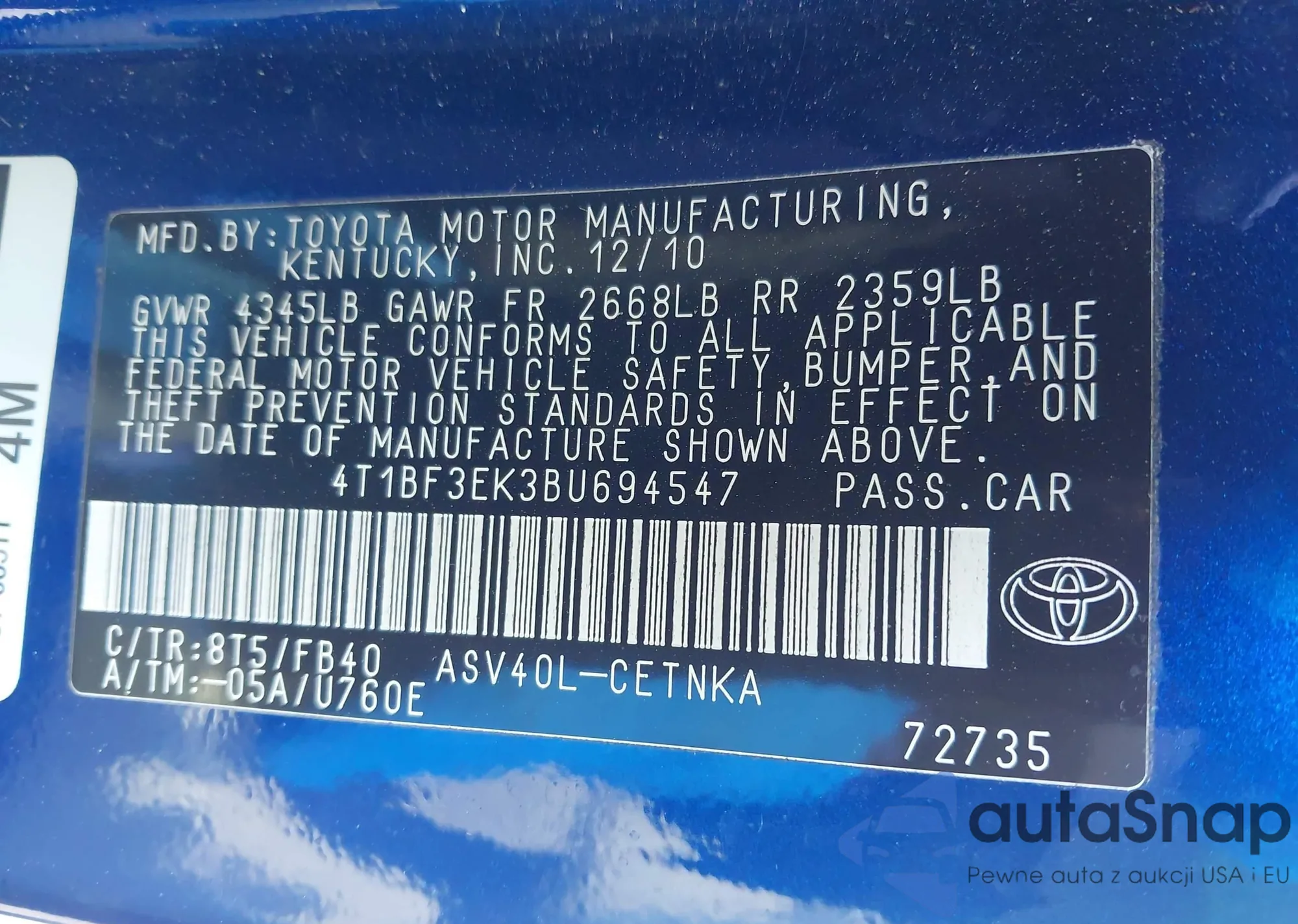• VIN 4T1BF3EK3BU694547