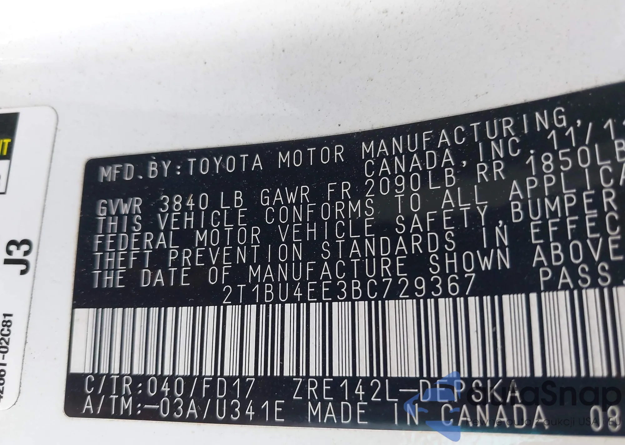 LOT: 42360776 VIN: 4T4BF3EK0BR102446