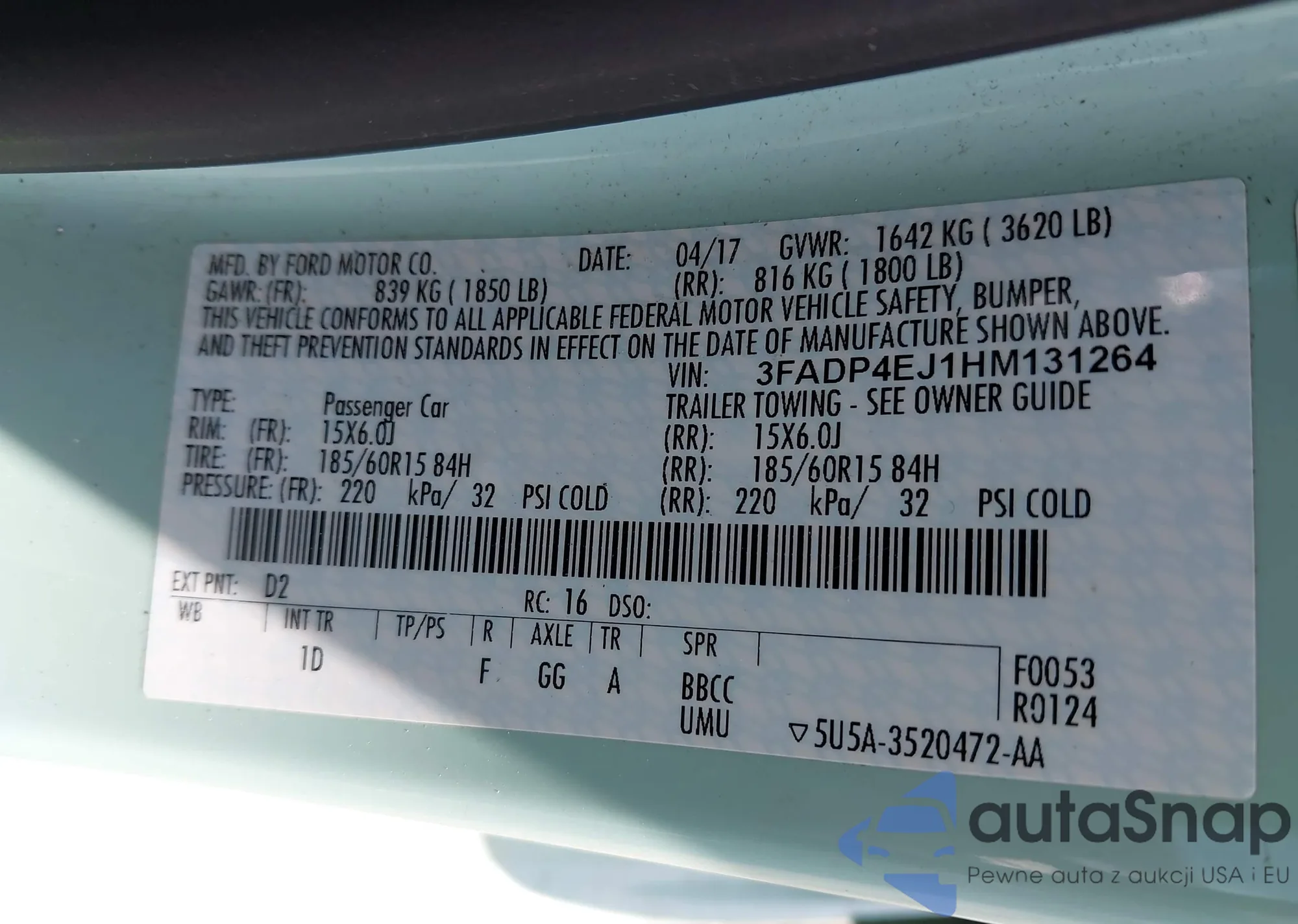 LOT: 42244037 VIN: 3FADP4EJ1HM131264