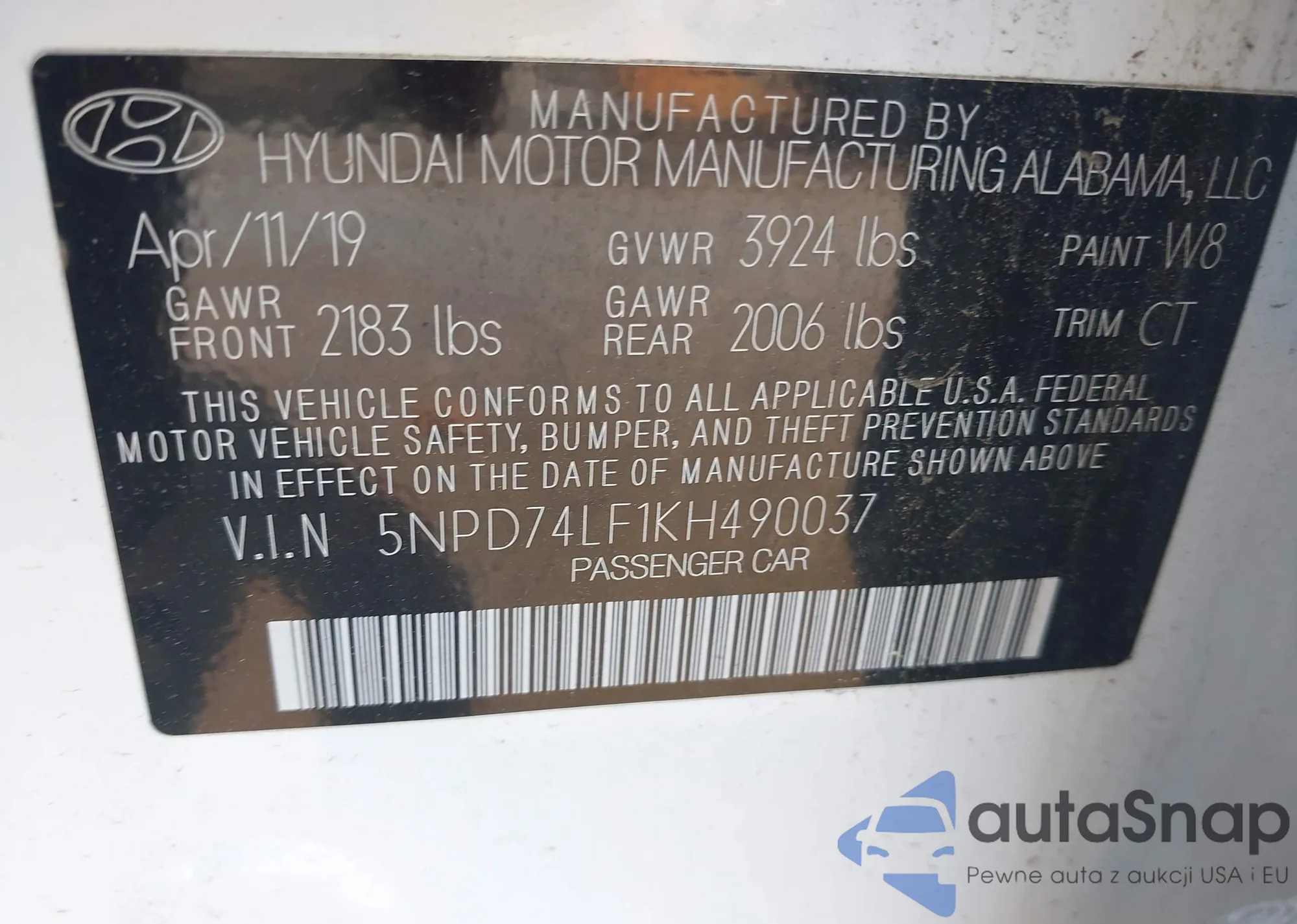 LOT: 42412812 VIN: 5NPD74LF1KH490037
