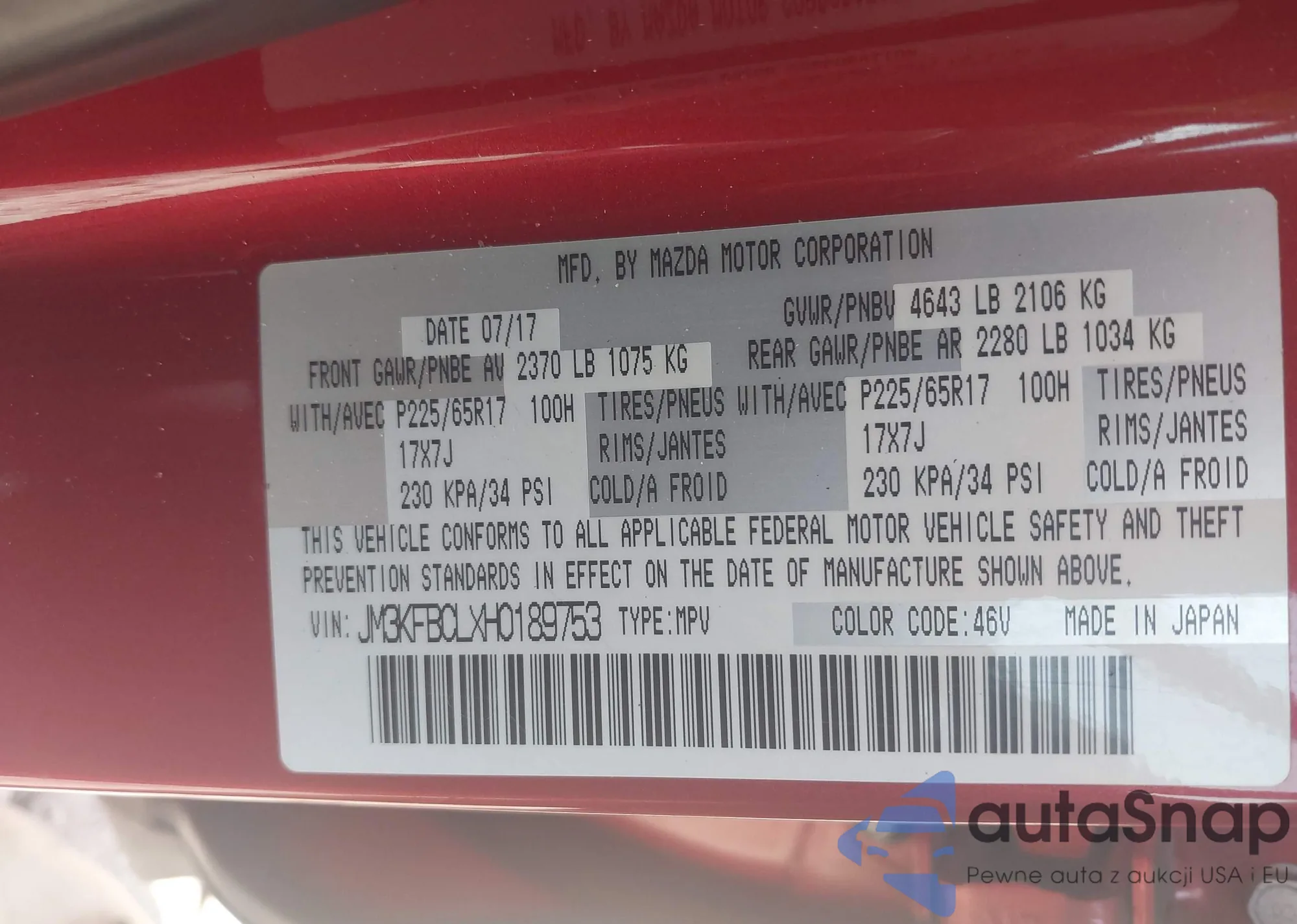 LOT: 42119375 VIN: JM3KFBCLXH0189753