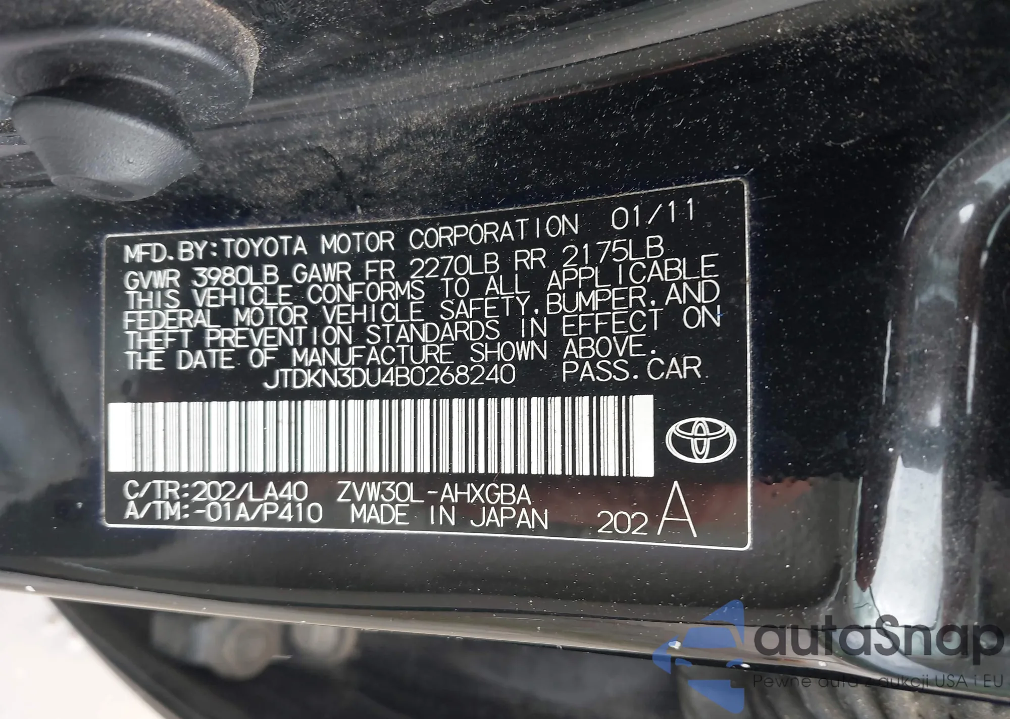 LOT: 42506543 VIN: JTDKN3DU4B0268240