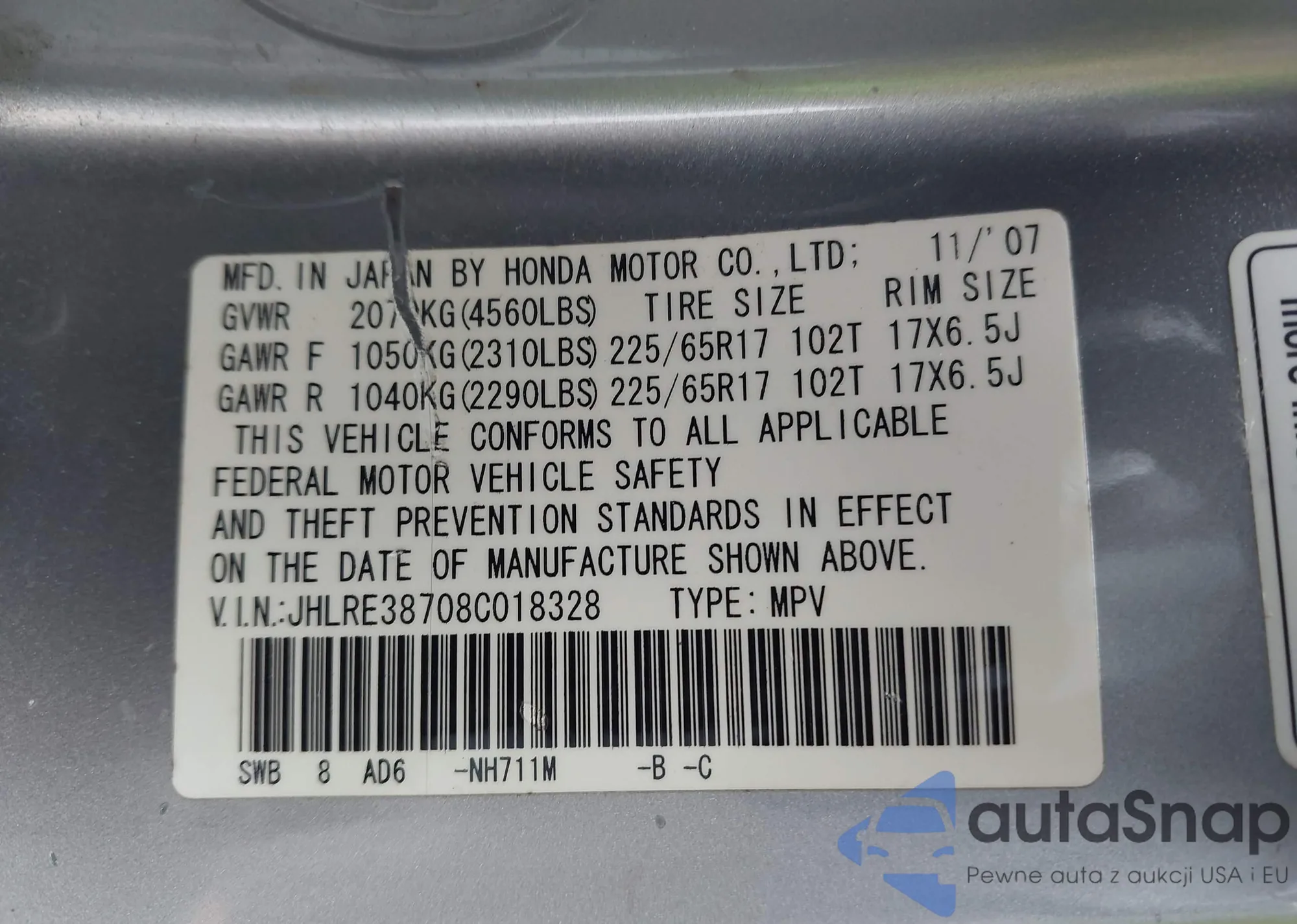 • VIN JHLRE38708C018328