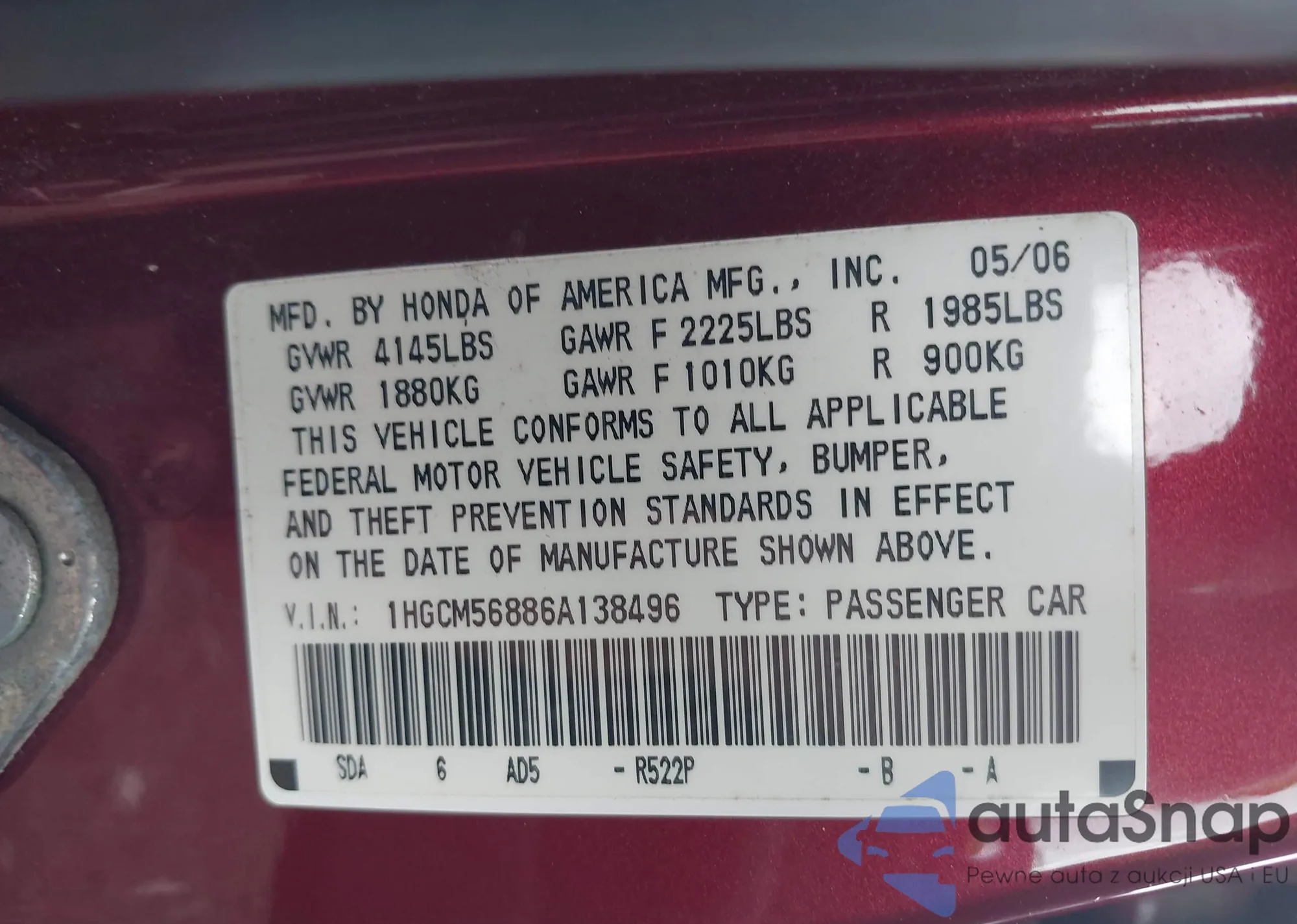 LOT: 40151473 VIN: 1HGCM56886A138496