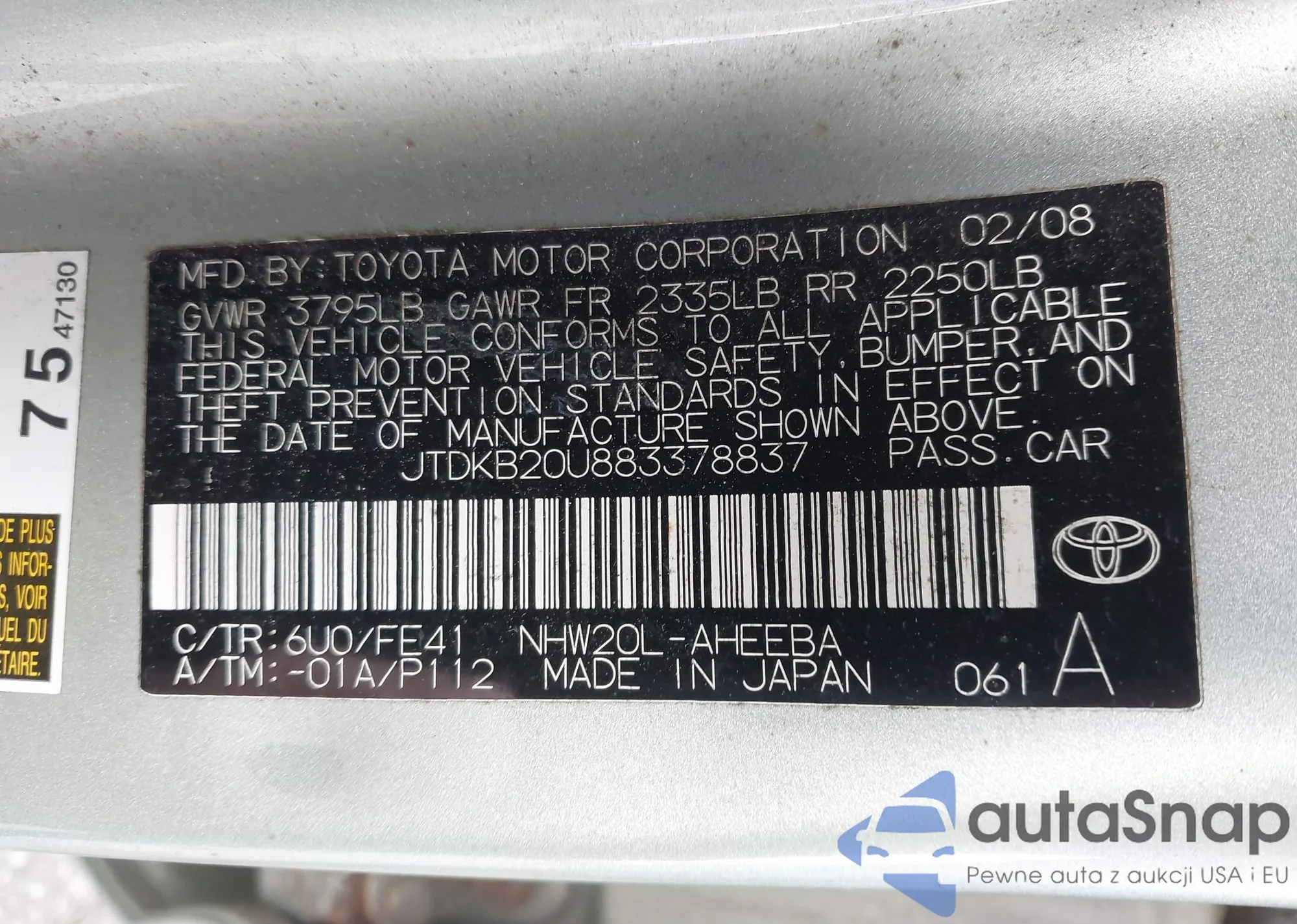LOT: 41867366 VIN: JTDKB20U883378837
