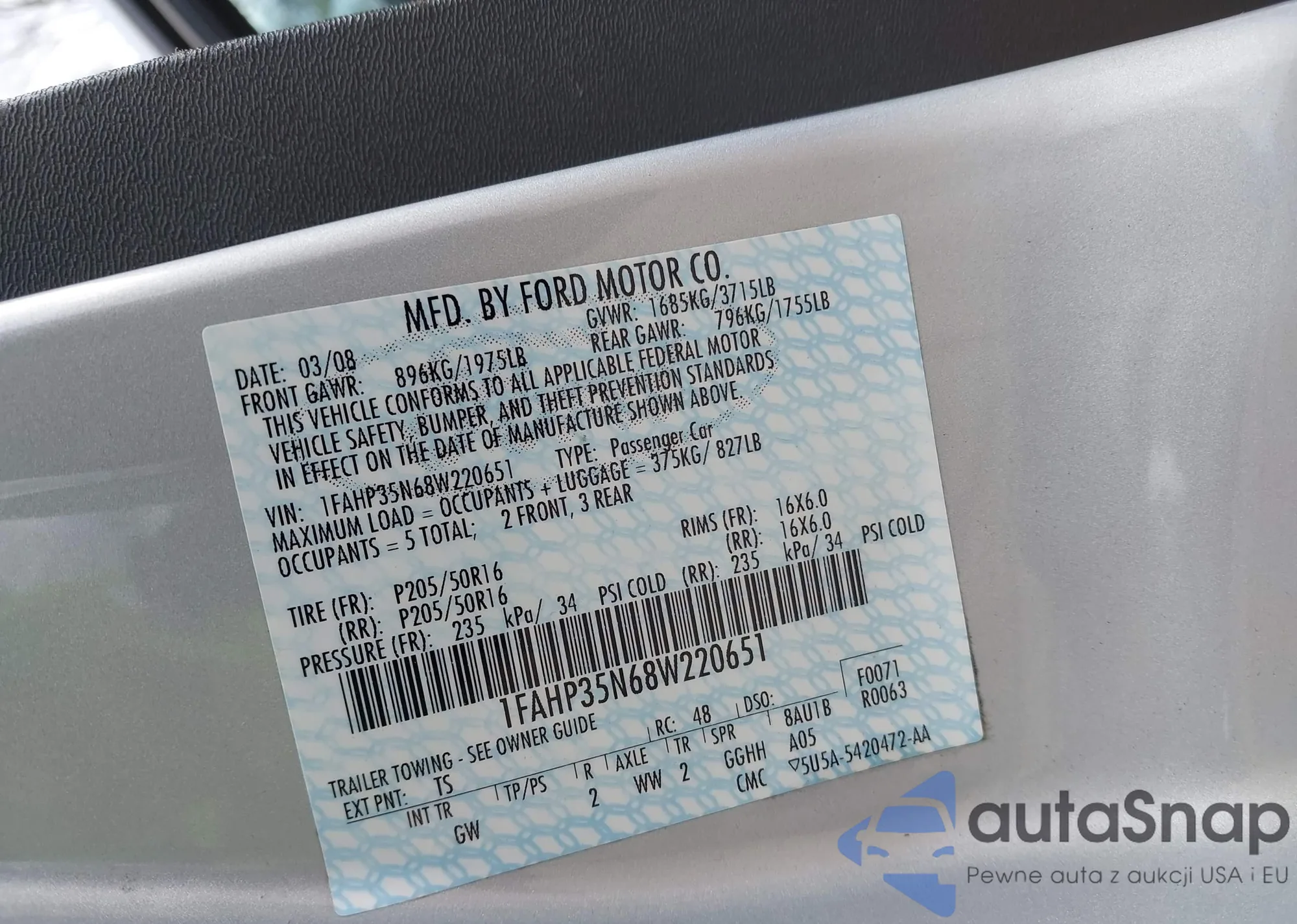 LOT: 41449418 VIN: 1FAHP35N68W220651