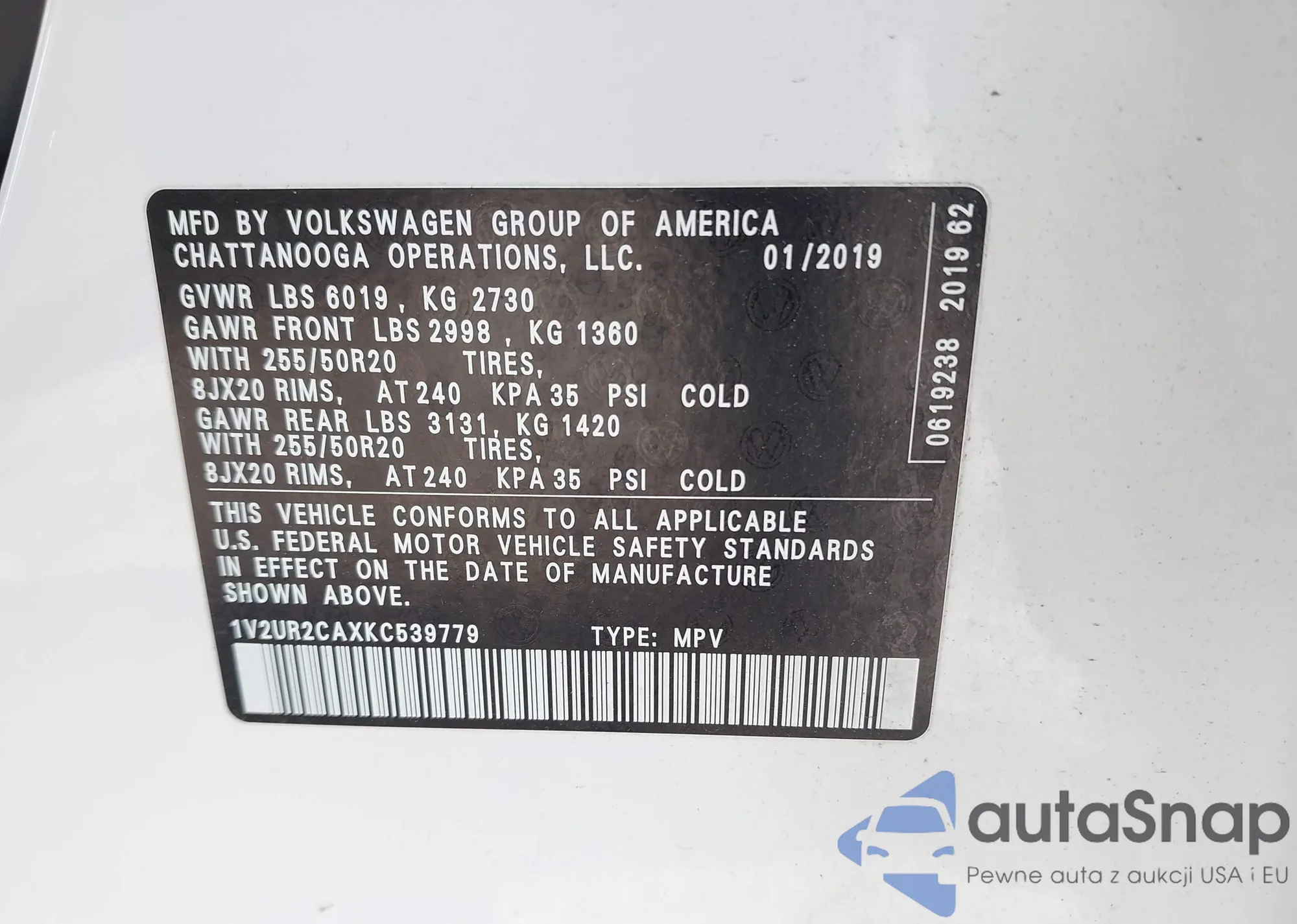 LOT: 42188614 VIN: 1V2UR2CAXKC539779
