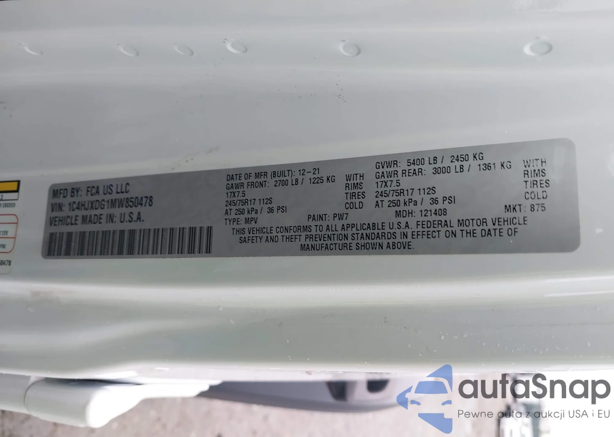 • VIN 1C4HJXDG1MW850478