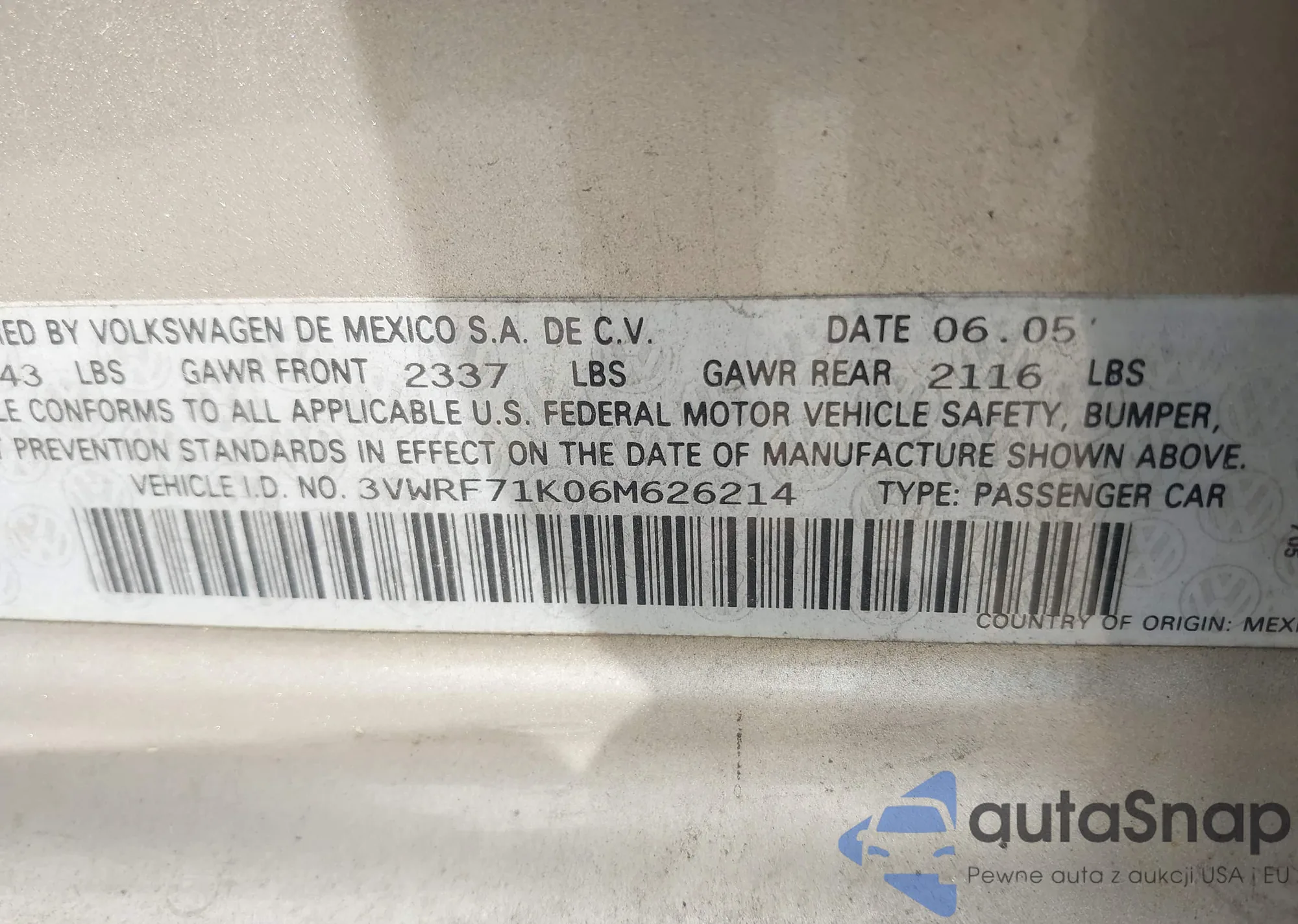 • VIN 3VWRF71K06M626214